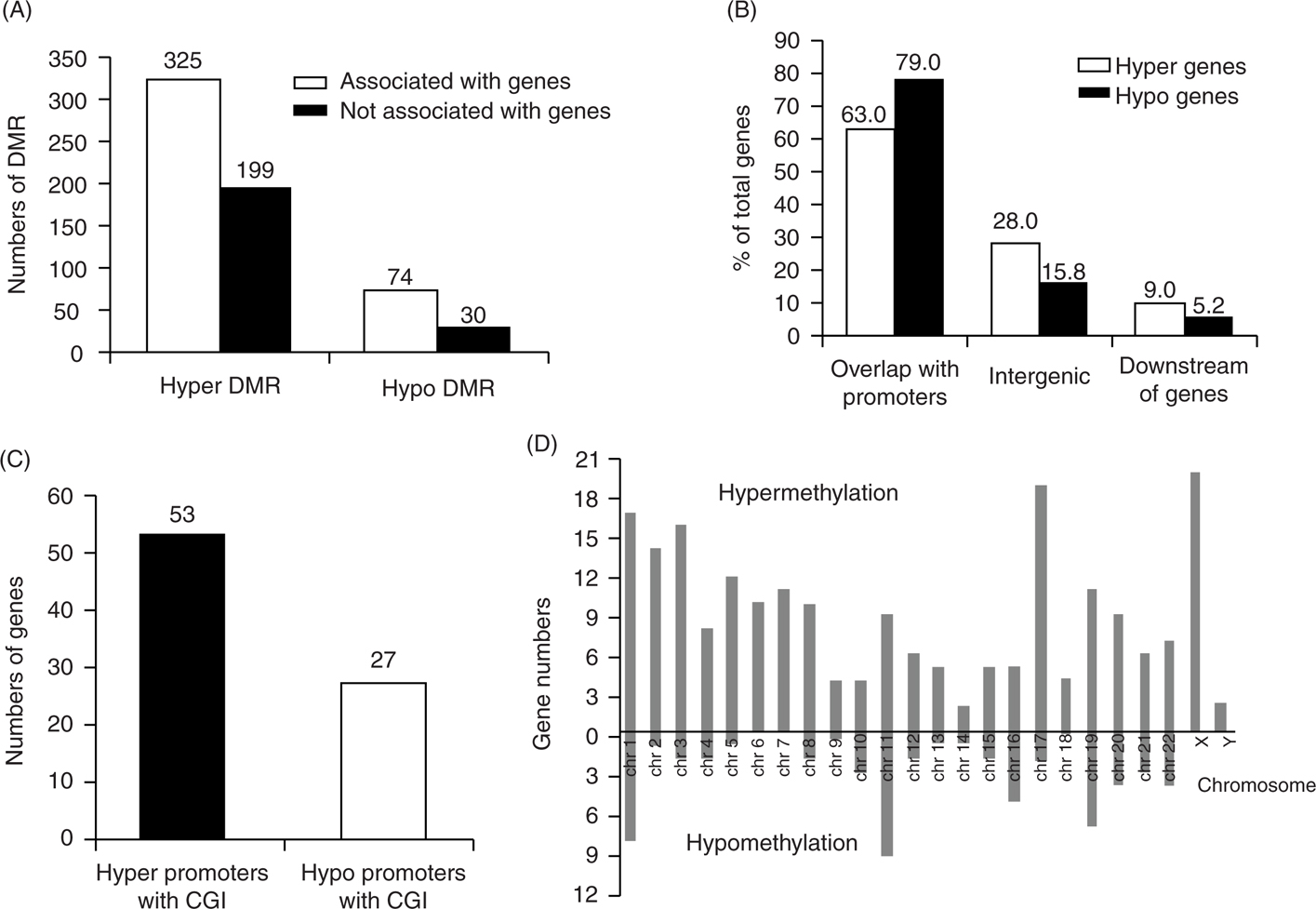 Figure 1 Genome-wide analysis of DMRs in primary glioblastoma. (A) DMRs (differentially methylated regions) are correlated with or without genes. (B) Distribution of DMRs is correlated with genes. Most identified DMRs are mapped to gene promoters. (C) Numbers of DMRs are mapped to both gene promoters and CpG islands. (D) Chromosomal distribution of 60 promoter hypomethylated genes and 216 promoter hypermethylated genes (Zuping Zhang, Guiyuan Li. Study on epigenetic mechanisms of glioma. Doctoral thesis, Central South University, 2009; 12).