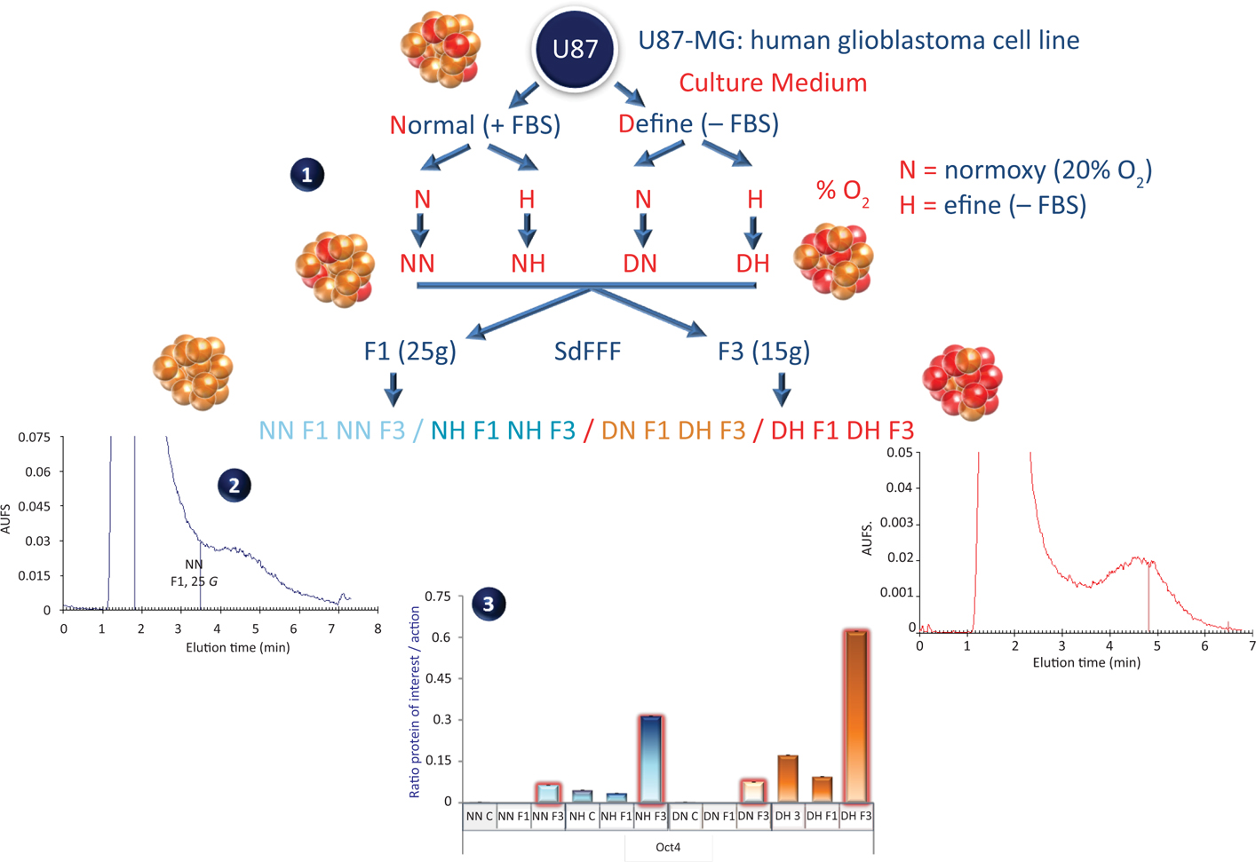 Figure 2 Representation of the global method used to enrich CSCs from human glioblastoma cell line. Four conditions are established with different media and oxygen tensions, namely, NN, NH, DN, and DH, in order to obtain a matrix of CSCs enrichment (1). CSC level is increased by the use of SdFFF cell sorting method (2: representative fractograms). Oct4 stem cell marker expression (3) in subpopulations obtained after SdFFF sorting (F1/F3), compared to crude (C) populations. Concerning fractograms (2), the optimal elution conditions were: injection of 2×105 U87-MG cells; flow rate: 0.80 mL/min; mobile phase: sterile PBS, pH = 7.4; and external multi-gravitational field strength: 15 or 25.00 ± 0.02 g (312 or 412 ± 0.2 rpm). These optimal elution conditions allowed cell separation under the biocompatible hyperlayer elution mode. Time-dependent collected fractions F1 and F3 corresponded to differentiated and cancer stem cells, respectively.