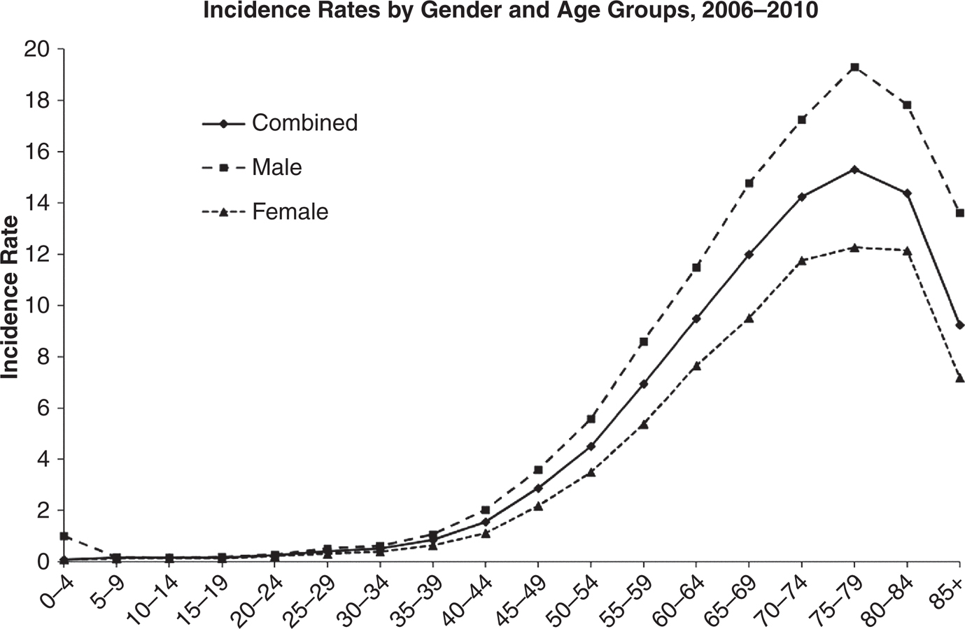Figure 1 Age-adjusted and age-specific incidence rates for glioblastoma at diagnosis and gender, CBTRUS statistical report: NPCR and SEER, 2006–2010. X-axis, age groups; Y-axis, incidence rates. Rates are per 100,000 and age-adjusted to the 2000 US standard population. NPCR, CDC’s National Program of Cancer Registries; SEER, NCI’s Surveillance, Epidemiology, and End Results program. (Adapted from Ref. (11).)