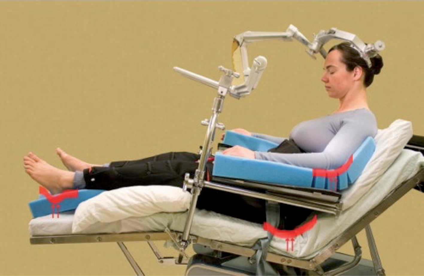 Figure 5 Although it has lost its popularity, sitting position is still used in some surgical centers. Attention must be paid to avoid pressure points (red arrows). The head is partially flexed and the neck turned to lesion side. All care must be taken to prevent neural injury of the spinal cord or the brachial plexus with continuous neurophysiological monitoring. Air embolism detection is essential to avoid complications. Used with permission from the original copyright holder, Elsevier.