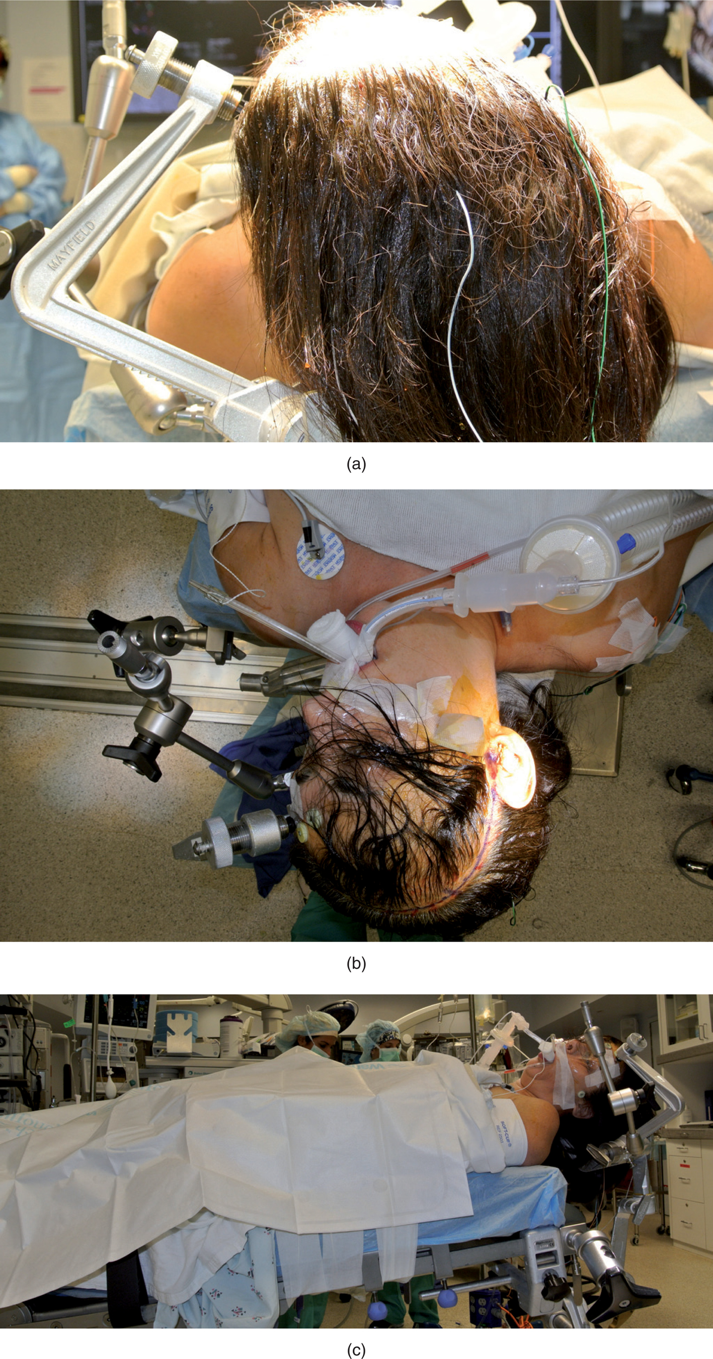 Figure 4 Head-fixation system is recommended when the neuronavigation system is used. The head clamp must be firmly secured to the skull. Special attention is required when awake craniotomy is performed (a). Head rotation should be limited to the patient’s cervical spine condition and to avoid reducing venous return (b). The head must be maintained above the heart level to reduce bleeding (c). (Courtesy of Prof. Alfredo Quiñones-Hinojosa.)