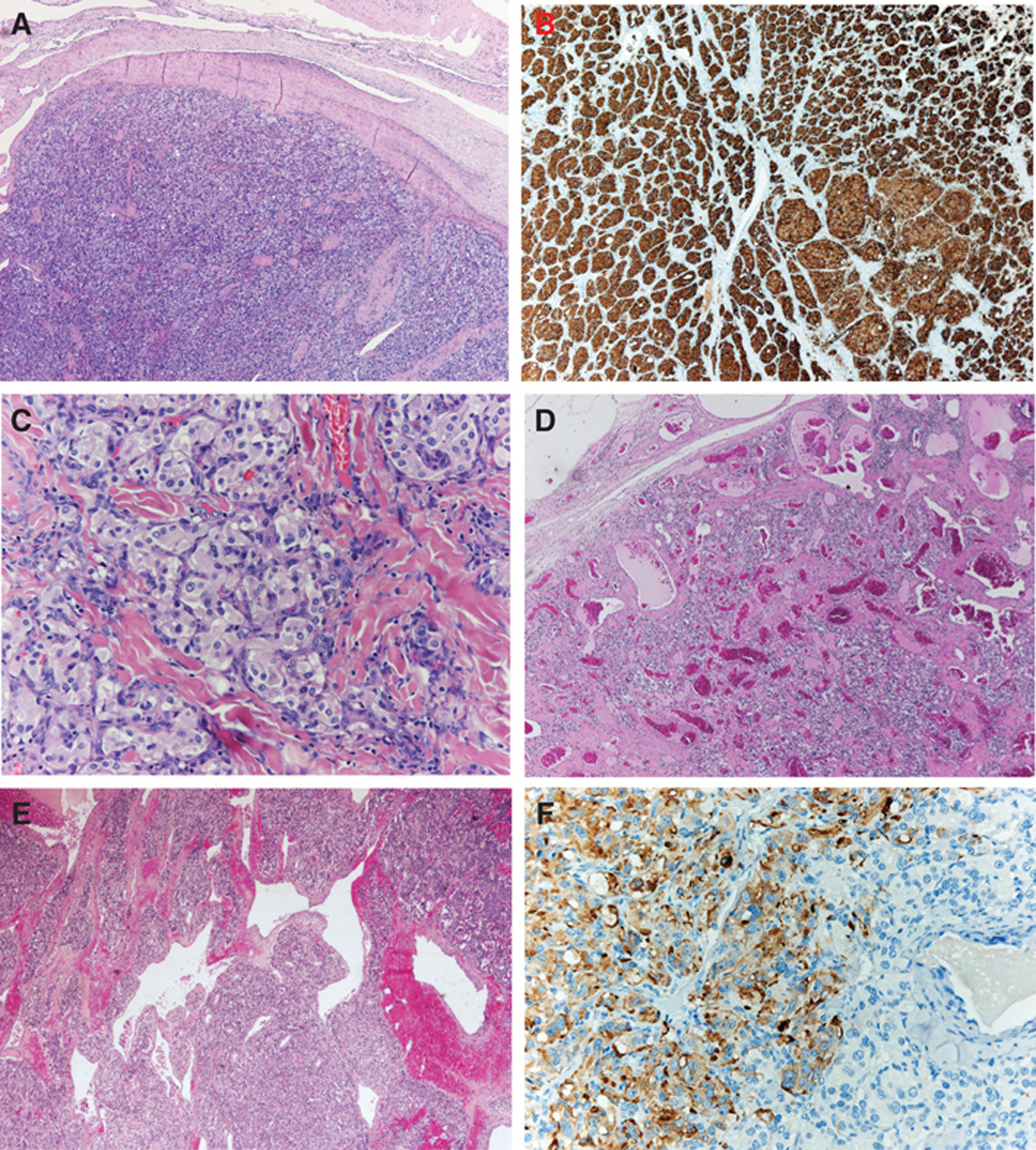Figure 1 Histological patterns of vagal and carotid body paragangliomas. (A) Vagal paraganglioma with well-formed pseudocapsule (HE, 40x). (B) Carotid body paraganglioma: the meshwork of chief cells is highlighted by synaptophysin immunostaining (40x). (C) Carotid body paraganglioma: sclerotic septa and large chief cells with oncocytic appearance (HE, 200x). (D–E) Hemangiopericytomatous patterns in carotid body paragangliomas (HE, 40x). (F) Carotid body paraganglioma: wide variability of chromogranin A immunostaining of chief cell.(200x).