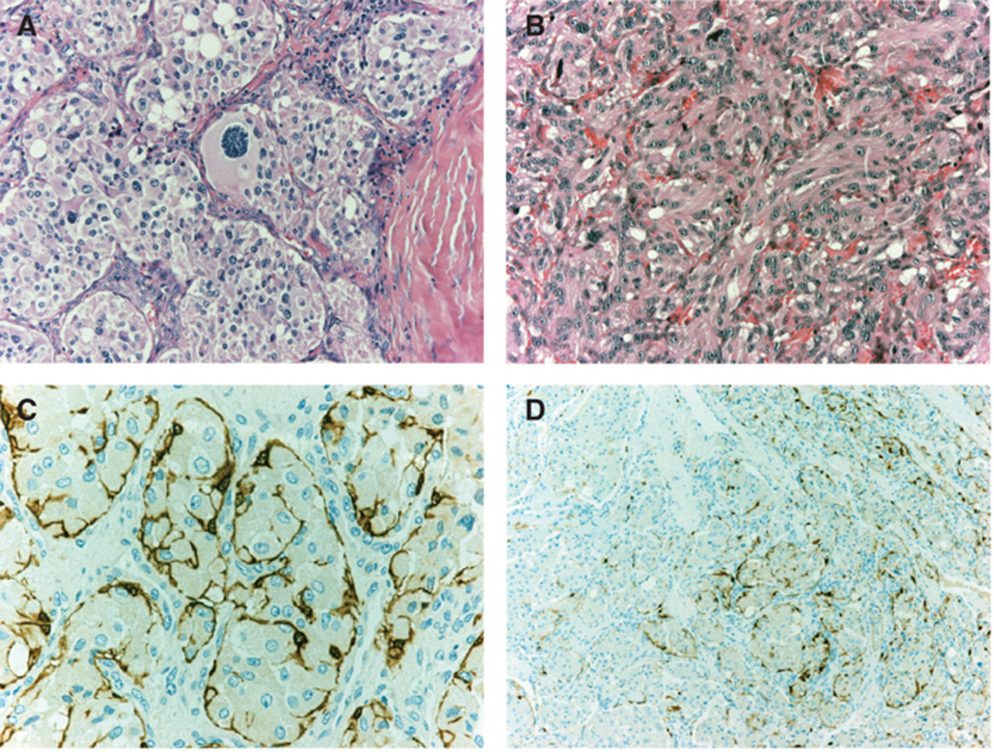 Figure 2 Atypical patterns and sustentacular cells in carotid body and vagal paragangliomas. (A) Atypical monster cell in carotid body paraganglioma (HE, 200x). (B) Carotid body paraganglioma with a pseudosarcomatous pattern (HE, 200x). (C) Carotid body paraganglioma with dendritic processes of sustentacular cells highlighted by immunostaining with antibody to S-100 (400x). (D) Carotid body paraganglioma showing dishomogeneous distribution of the sustentacular cells, immunostained with anti-S-100 (100x).