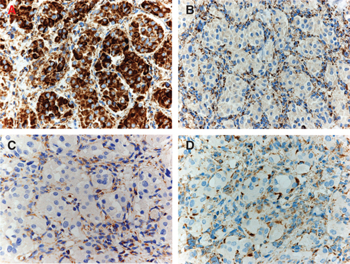 Figure 3 SDH immunostaining in vagal and carotid body paragangliomas. (A, B) Vagal paraganglioma: marked immunoreactivity for SDHA in all cell types (A) and no immunoreactivity of chief cells for SDHB (B) (400x). (C) Carotid body paraganglioma: faint staining for SDHB of sustentacular and endothelial cells, with negativity of chief cells (400x). (D) Carotid body paraganglioma: moderate staining for SDHA of sustentacular and endothelial cells, with negativity of chief cells (400x).