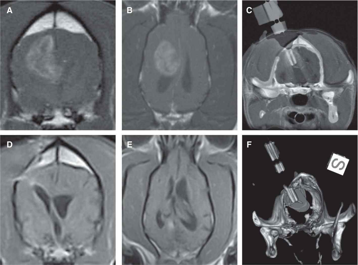Figure 3 Stereotactic glioblastoma ablation with irreversible electroporation (IRE). Pretreatment transverse (A) and dorsal planar (B) post-contrast T1-weighted MR demonstrating ring-enhancing glioblastoma in the frontoparietal lobe of the cerebrum. Co-registered intraoperative CT and pre-treatment MR images (C) and three-dimensional reconstructed CT (F) with IRE electrodes in situ within the tumor in preparation for ablation. Three-month post-IRE treatment transverse (D) and dorsal planar (E) post-contrast T1-weighted MR illustrating 95% reduction in tumor burden.