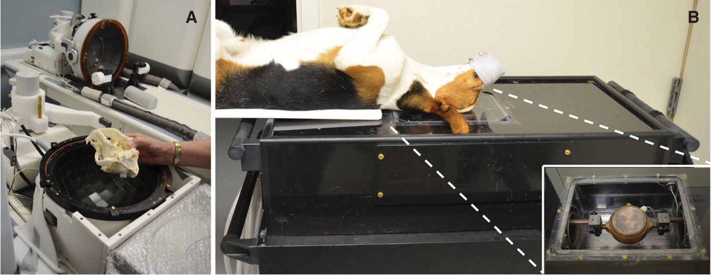 Figure 5 Evaluation of TcFUS instrumentation in the canine model. Canine skull (A) positioned in the Exablate platform (InSightec Ltd., Dallas, TX, USA) hemispheric transducer array. In the background, an additional Exablate hemispheric transducer and couch are visible illustrating the equipment configuration that would be used to treat a human brain. Canine positioned on the RK-100 couch (FUS Instruments, Toronto, Ontario, Canada) system in preparation for transport into the MR suite for TcFUS BBB opening. Note the size difference in the transducers between the two systems (B, inset).