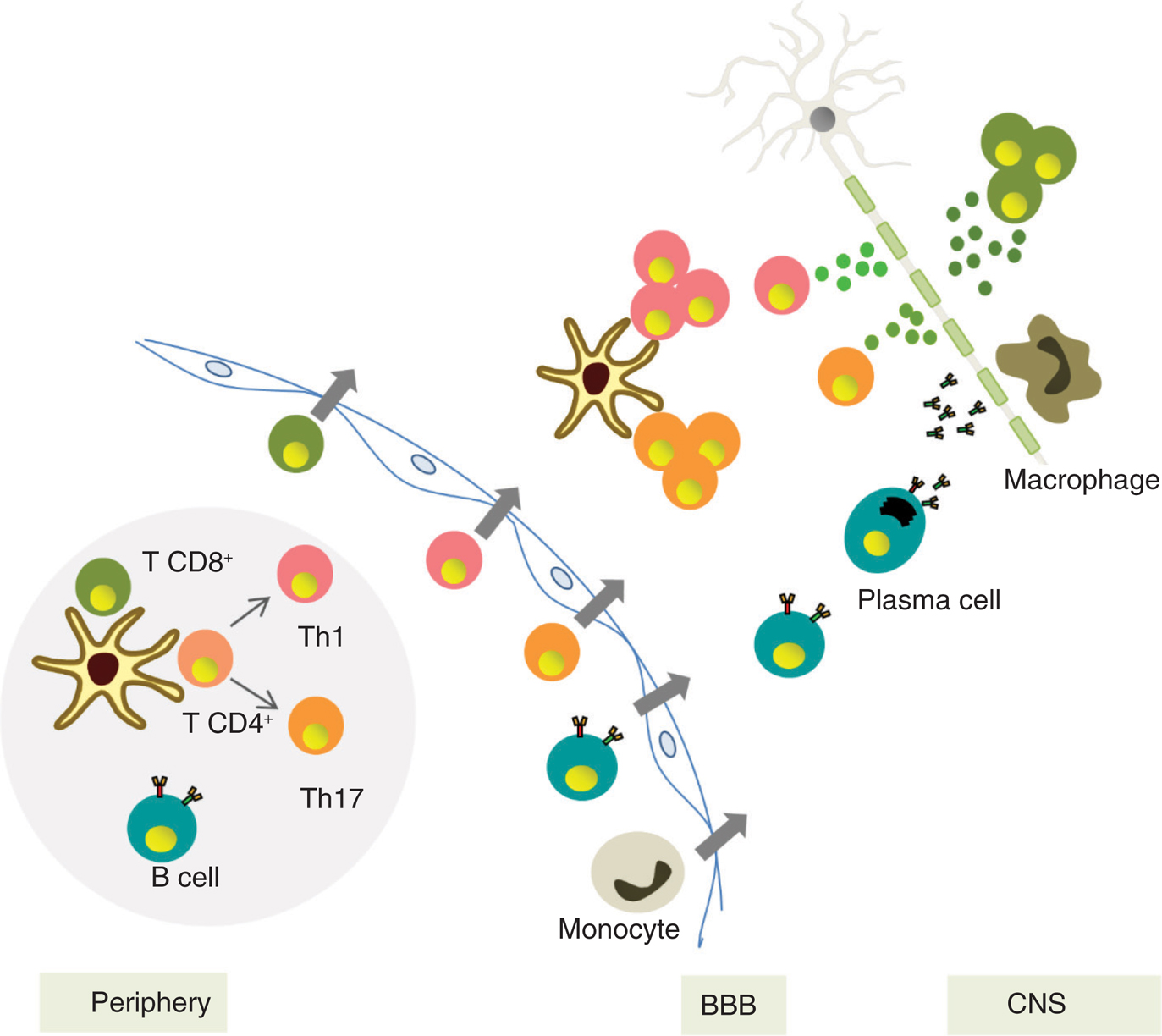 Figure 1 Pathogenic mechanisms of multiple sclerosis. Autoreactive T-cells and B-cells are activated in peripheral lymph nodes where they are differentiated into effector cells, CD8+ T-cells, and CD4+ T-cells (Th1 and/or Th17). Activated cells migrate through the blood–brain barrier (BBB) where they are further activated by local antigen-presenting cells. These processes induce cytokine and chemokine production, facilitating the entry of other cell types from peripheral blood. At the central nervous system (CNS), macrophages and activated T-cells attack myelin components and release cytokines that activate B-cells which mature to antibody-producing plasma cells. This increases the inflammatory response and causes demyelination and axonal damage.