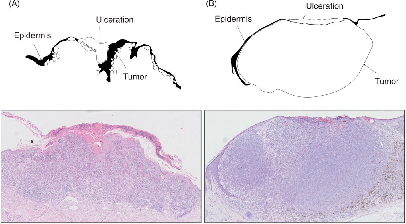 Figure 2 An illustration of the type of epidermal involvement and ulceration in melanoma. (A) Infiltrative ulceration with melanoma cells that infiltrate and erode the epidermal layer. (B) Attenuative ulceration where nodular growth stretches and eventually disrupts the epidermal layer, with minimal epidermal infiltration. (Adapted from Am J Clin Pathol 2014;142(6):845–856.)