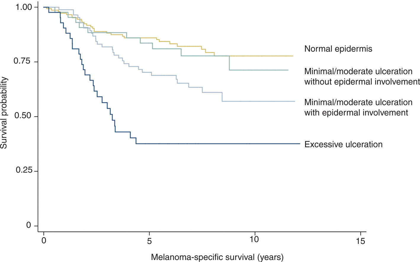 Figure 3 Kaplan–Meier survival curves, illustrating the prognostic impact of the extent of ulceration and the involvement of the surrounding epidermis. Combining the extent of ulceration (as percentage of the ulceration length over the total tumor length, > or <70%) and epidermal involvement (presence of either consumption of epidermis, re-epithelialization, or reactive epidermal hyperplasia) provided additional prognostic information. (Adapted from Am J Clin Pathol 2014;142(6):845–856.)