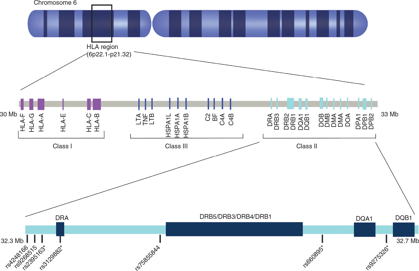 Figure 2 Single nucleotide polymorphisms (SNPs) in the human leukocyte antigen (HLA) locus associated with increased risk for Parkinson’s disease (PD). Map of HLA class I, II, and III regions indicating alleles and SNPs associated with PD. An asterisk (*) denotes that the SNP is acting as an expression quantitative trait locus (eQTL). (Adapted from Ref. 85).