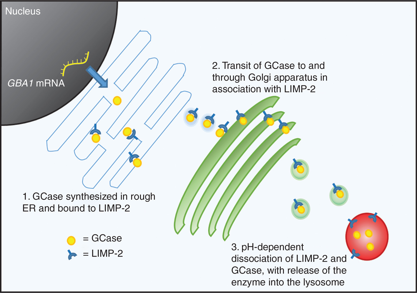 Figure 1 Synthesis and processing of GCase. GCase is synthesized in the rough ER where it becomes associated with LIMP-2. These two proteins transit in complex to the Golgi apparatus for processing. The GCase–LIMP-2 complex then migrates to the lysosome, where GCase is released into the lysosomal compartment, facilitated by pH-dependent dissociation from LIMP-2. ER, endoplasmic reticulum; GCase, glucocerebrosidase; LIMP-2, lysosomal integral membrane protein-2; mRNA, messenger ribonucleic acid.
