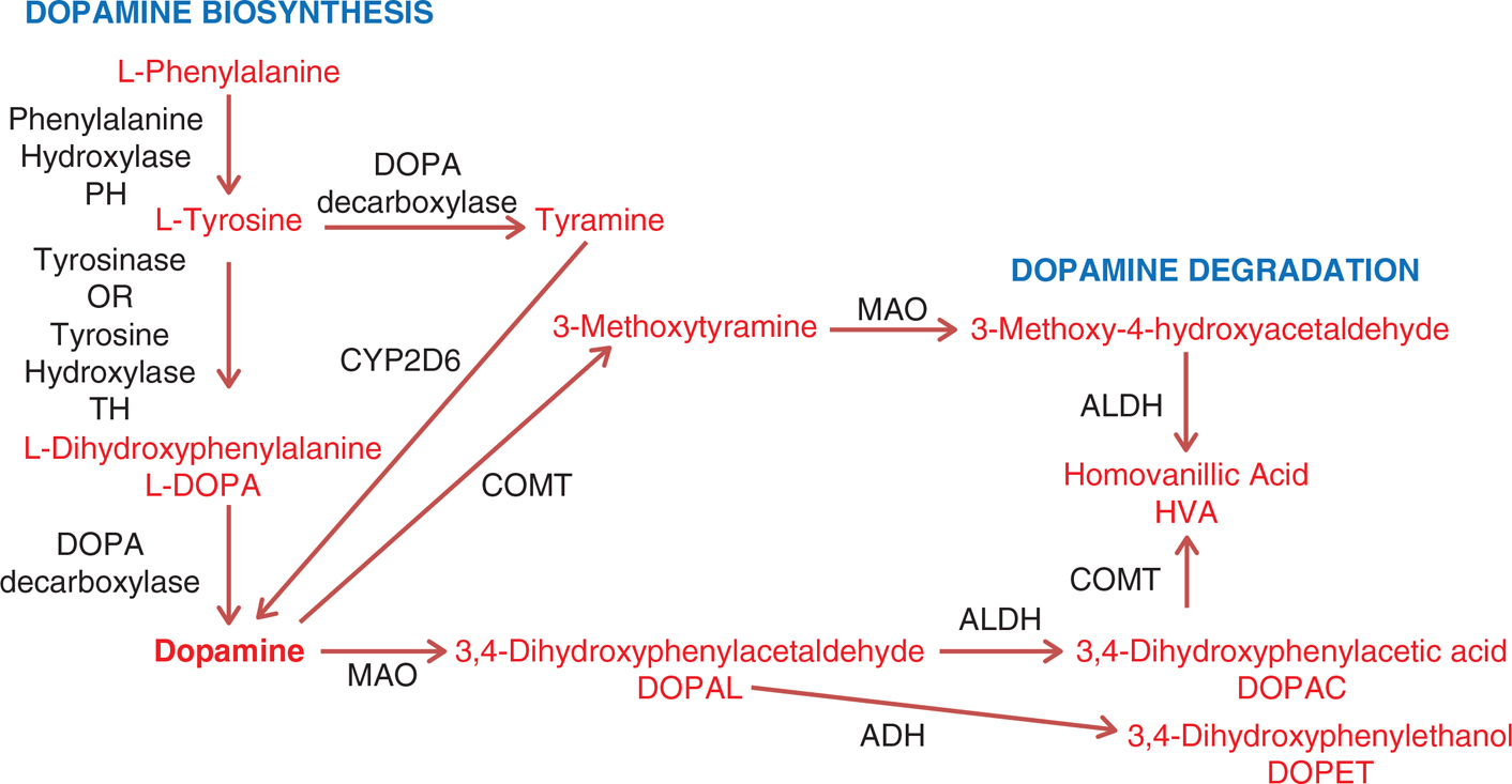 Figure 1 Metabolic pathway of dopamine synthesis and clearance. Dopamine is synthesized from phenylalanine or tyrosine via sequential reactions catalyzed mainly by PH, TH, and DOPA decarboxylase. It can also be synthesized from tyramine in a minor pathway by CYP2D6. Dopamine is effectively degraded into the main inactive metabolites DOPAC and HVA via a series of reactions mediated predominantly by the enzymes MAO, COMT, ALDH, and ADH.