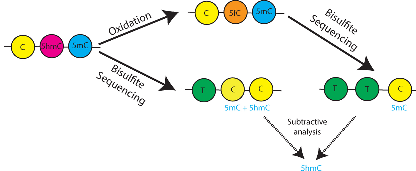 Figure 1 During bisulfite sequencing (BS-seq), unmodified cytosines (C) are read as thymines (T), while methylated (5mC) and hydroxymethylated cytosines (5hmC) are protected from bisulfite conversion and read as C. In this scenario, BS-seq does not discriminate 5mC from 5hmC. Oxidative bisulfite sequencing (oxBS-seq) includes an oxidation step, during which 5hmC is converted to 5fC and read as T after bisulfite sequencing, similar to unmodified C, while only 5mC is read as C. 5hmC proportions are computed by subtracting oxBS-seq signals from BS-seq signals.