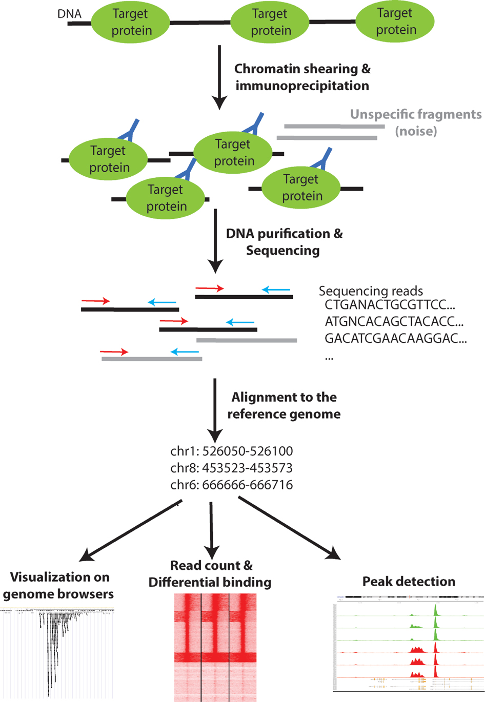 Figure 3 ChIP-seq workflow. Sheared chromatin is incubated with an antibody directed against the target protein. Upon purification, the captured DNA is then subjected to high-throughput sequencing, and the resulting reads are aligned to the reference genome. Aligned reads can be visualized on genome browsers and computed to identify binding sites of target proteins.