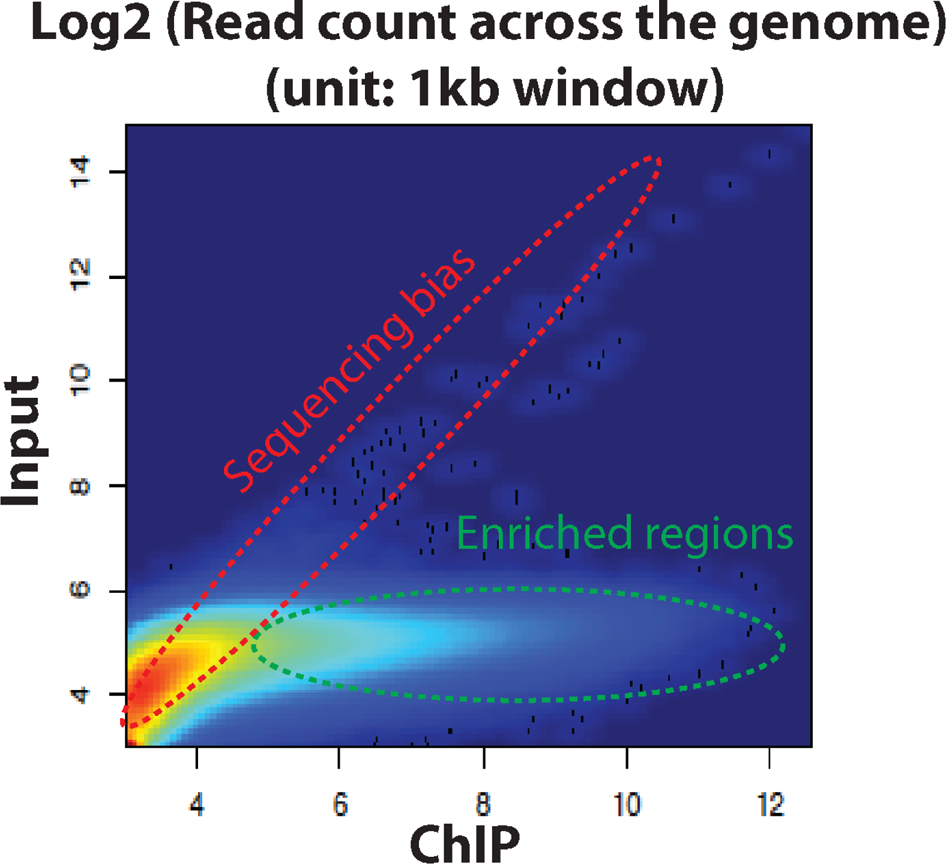 Modeling the background distribution of reads is an important step in peak detection and can be performed from the input control, but not all studies include this control. Consequently, the majority of algorithms model the intrinsic background of ChIP samples. While this approach performs well for narrow-peak experiments, it provides poor results for diffuse enriched regions. In our opinion, the input control should be included in all ChIP-seq experiments. A simple scatter plot comparison of read counts over genomic windows from ChIP samples versus the input control (Figure 4) provides a primary evaluation of ChIP-seq quality. Additionally, we believe that the input control is mandatory for investigating heterochromatin marks, given their genomic distribution. Finally, particular attention should be paid to repetitive elements that produce very short peaks with a high number of reads, as these peaks represent sequencing biases rather than binding events.