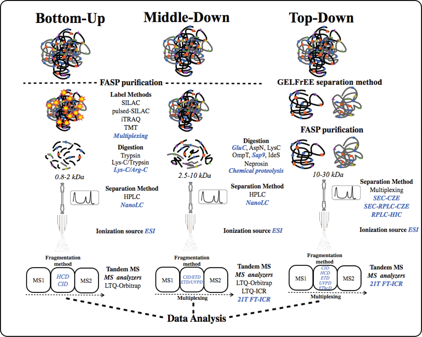 Figure 2 Bottom–up, middle–down and top–down proteomic high-throughput approaches. A general view of each of the approaches and the essential steps to follow are shown from top to bottom. Up-to-date tools, methodologies and techniques most commonly and successfully applied for high-throughput proteomic analyses are highlighted in blue for each of the approaches.