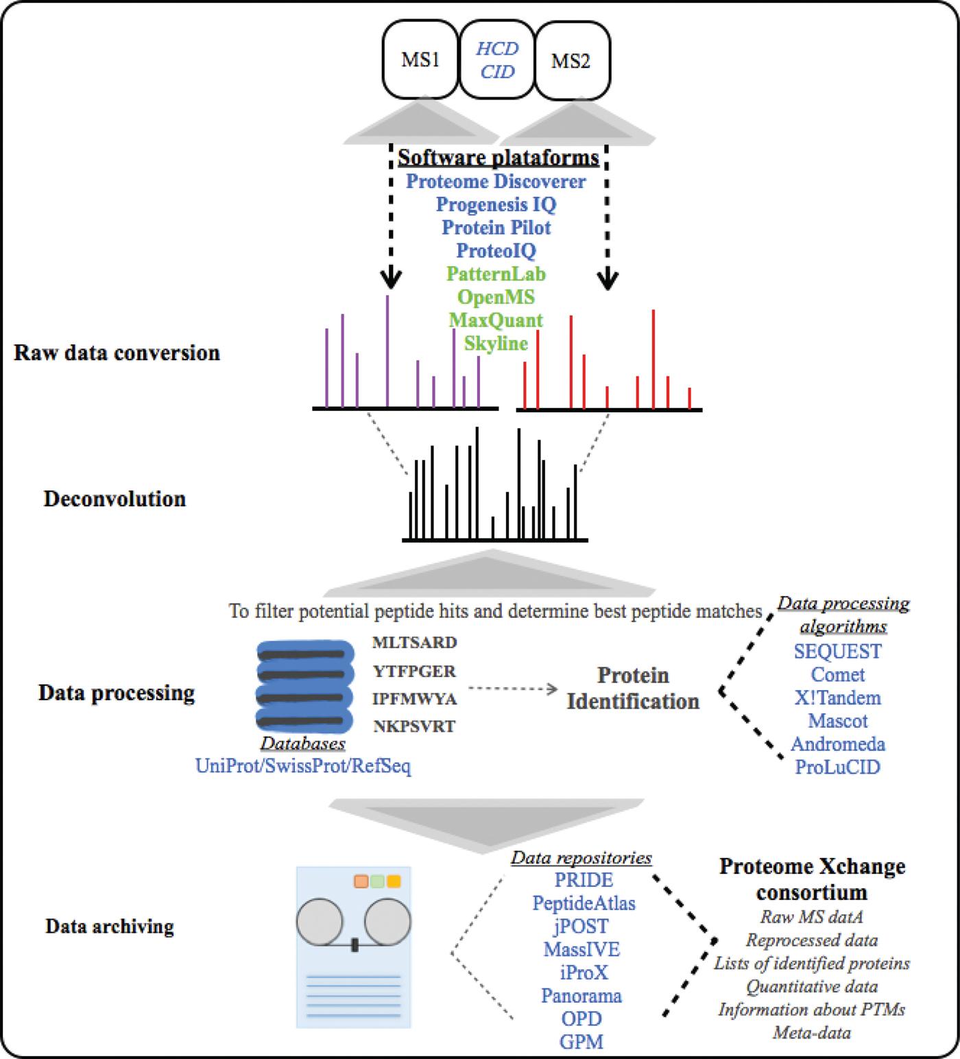 Figure 3 Data processing workflow from raw MS spectra to identified biomolecules. Raw data conversion, deconvolution, data processing and data archiving are the main steps illustrated. The most popular tools within each of them are highlighted in blue. Commercial (blue) and open-source integrated software platforms (green) for the analysis of proteomic data are included. They all encompass modules to manage raw spectral file data, peptide identification using search engines, clustering and sample comparison, identification of PTMs, quantification, statistical analysis and visualization tools. The most common data processing algorithms, data bases and data repositories to release data into the public domain are also shown.