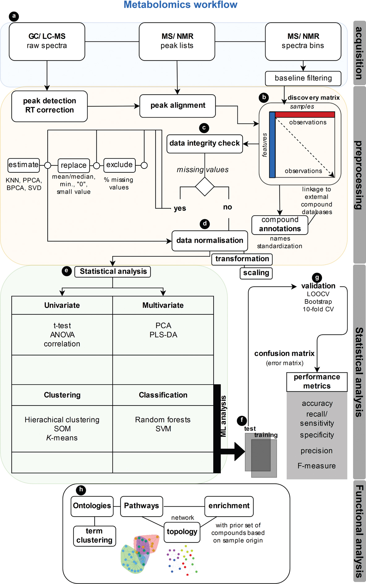 Figure 2 Metabolomics workflows. Data acquisition (a), pre-processing steps including discovery matrix generation (b), data integrity check (c) and data normalisation (d). Followed by statistical analysis (e), machine learning (ML) approaches (f) and validation based of randomisation (g), and functional analysis (h). Abbreviations: Gas Chromatography (GC), Liquid Chromatography (LC), Mass Spectrometry (MS), Nuclear Magnetic Resonance (NMR), Leave-One-Out Cross Validation (LOOCV), n-times/fold Cross Validation (CV), k-nearest neighbours (KNN), probabilistic principal component analysis (PPCA), Bayesian principal component analysis (BPCA), singular value decomposition (SVD), analysis of variance (ANOVA), Principal Component Analysis (PCA), Partial Least Squares (PLS).