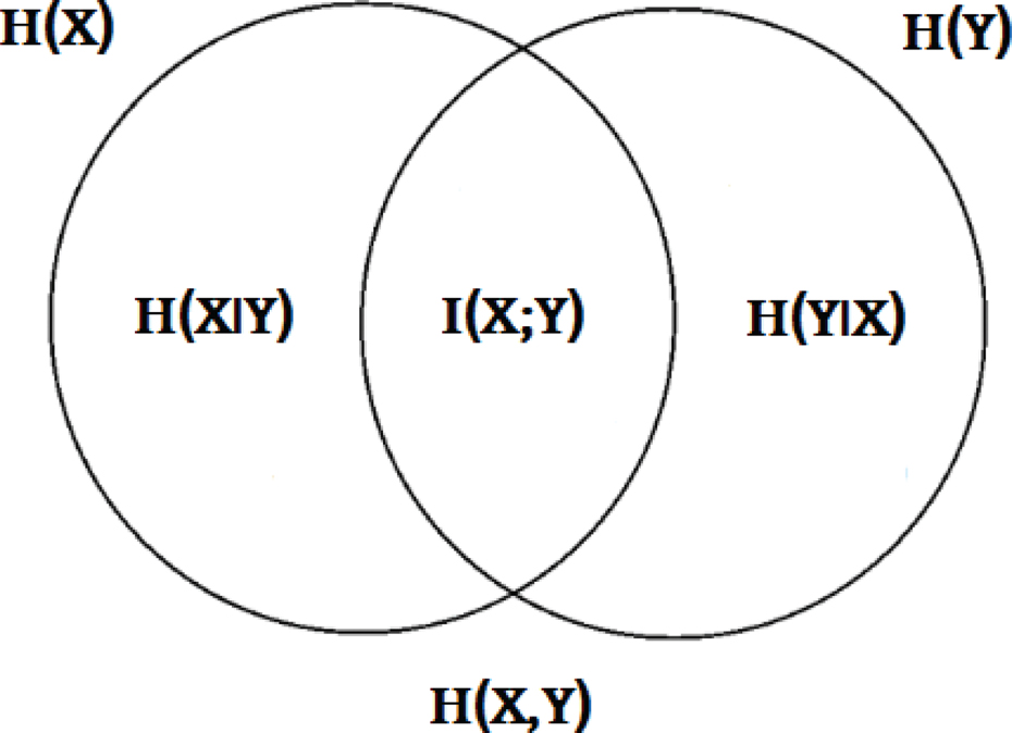 Let, two random variables X and Y with probability density functions f(X) and f(Y) from the support regions S and T, respectively. The three entropies (i.e., H(X), H(Y), and H(X, Y)), the mutual information I(X; Y), and the entropy of X conditioned on Y and vice versa (i.e., H(X|Y) and H(Y|X)), are shown graphically in Figure 2.