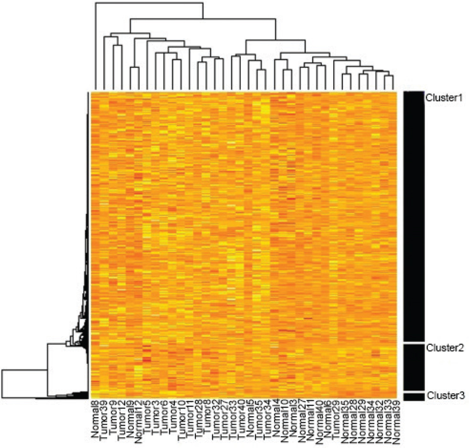 Before using entropy to select a gene set associated with colon cancer based on gene expressions, the hierarchical method was used for clustering of the genes (Figure 3). The figure shows that 3128 selected genes are shared in three clusters. However, the hierarchical cluster analysis dendrogram shows that the frequency of the yellow points (i.e., high gene expression) in tumor samples is higher than normal samples, but it is simply not possible to identify a set of most relevant genes with colon cancer recognition. In other words, in Figure 3 there is no specific visible pattern in the color spectrum. Usually, clustering is appropriate when a specific spectrum of colors can be found in normal and tumor samples. Therefore, although the genes are shared into three clusters in Figure 3, the obtained result is not accurate. One of the problems may be the lack of refinement of the levels of gene expression. In studies on gene expression analysis, data refinement process and the removal of outlier values are very important.