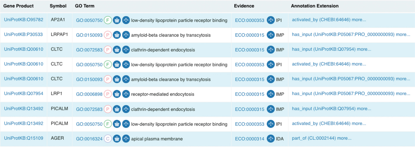 Figure 1 A selection of Gene Ontology annotations. This list of Gene Ontology annotations was downloaded from the QuickGO browser (37). All of these annotations, based on the experimental data presented by Zhao et al. (20), were created by the UCL Functional Gene Annotation group. The annotations were filtered by ‘PMID:26005850’. The columns, in order from left to right, are as follows: Symbol, HGNC-approved gene symbol; GO term, GO term identifier and name; Evidence, one of the many Evidence and Conclusion Ontology (ECO) codes (38) associated with each GO annotation to indicate the type of experiments that support the annotation (IDA, Inferred from Direct Assay; IMP, Inferred from Mutant Phenotype; IPI, Inferred from Physical Interaction); Annotation Extension, additional information about the annotations, for example, the location of the function (occurs_in CL:0002144, capillary endothelial cell), or the entity that activates the function (activated_by CHEBI:64646, amyloid-beta polypeptide 40).