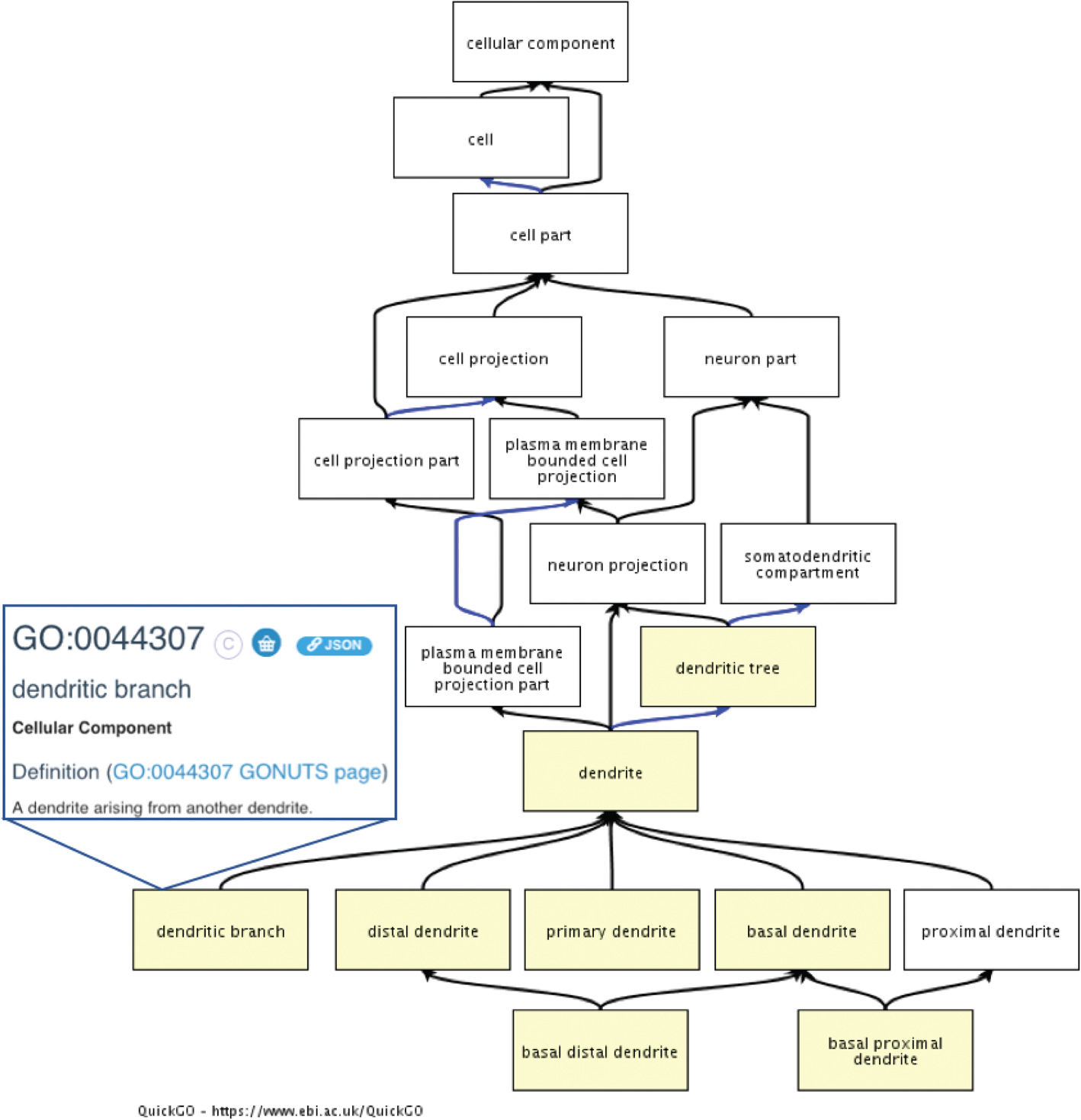 Figure 2 A selection of the dendrite Gene Ontology graph. This figure was generated by the QuickGO browser (37) and shows the is_a (black arrows) and part_of (blue arrows) hierarchy of just a small number of terms within the dendrite branch of the ontology; currently, the dendritic GO domain has 36 terms. The general term dendrite is used to group different types of dendrites, for example, primary dendrite and distal dendrite are both more descriptive child terms of dendrite. The definition (as displayed in QuickGO) of one of the GO terms, dendritic branch, is also included. The yellow highlighted terms were contributed by the UCL Functional Gene Annotation group.