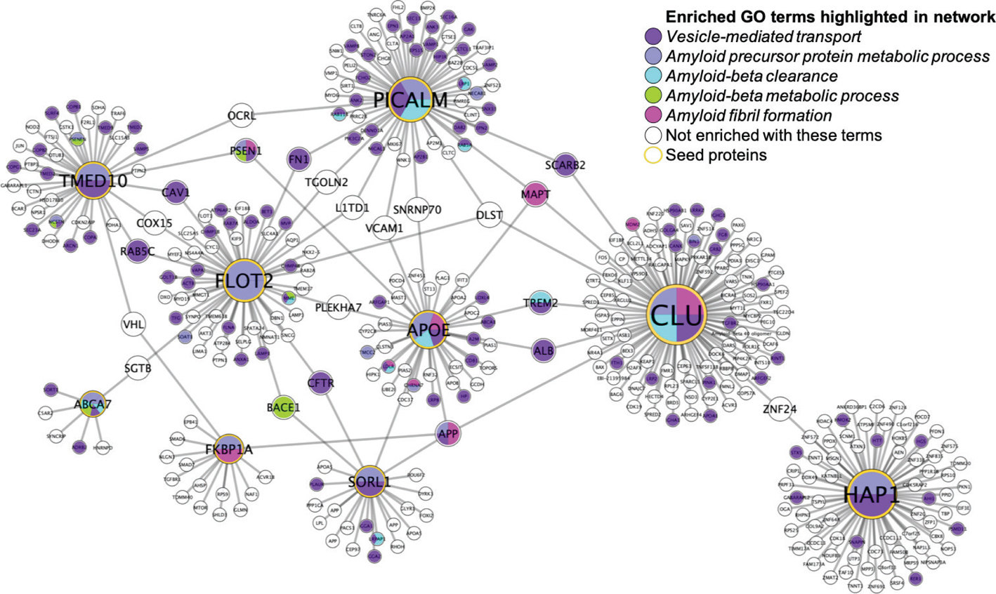 Figure 3 Network of proteins identified in Alzheimer’s disease meta-analysis. Nine proteins identified in an Alzheimer’s disease meta-analysis (14) due to their association with the GO term “regulation of amyloid precursor protein catabolic process” were used to seed an interaction network using Cytoscape (22) and five files available on the PSICQUIC web server (67) (IntAct, BHF-UCL, UniProt, MINT, and EBI-GOA-non-IntAct). The seed proteins are outlined in yellow. The network was analyzed using Golorize (68), BiNGO (69), and GO ontology and annotation files (36), as described in Denny et al. (29) (downloaded March 29, 2019). The proteins associated with a selection of the enriched GO terms (or one of their child terms, including regulation child terms) are shown in the network.