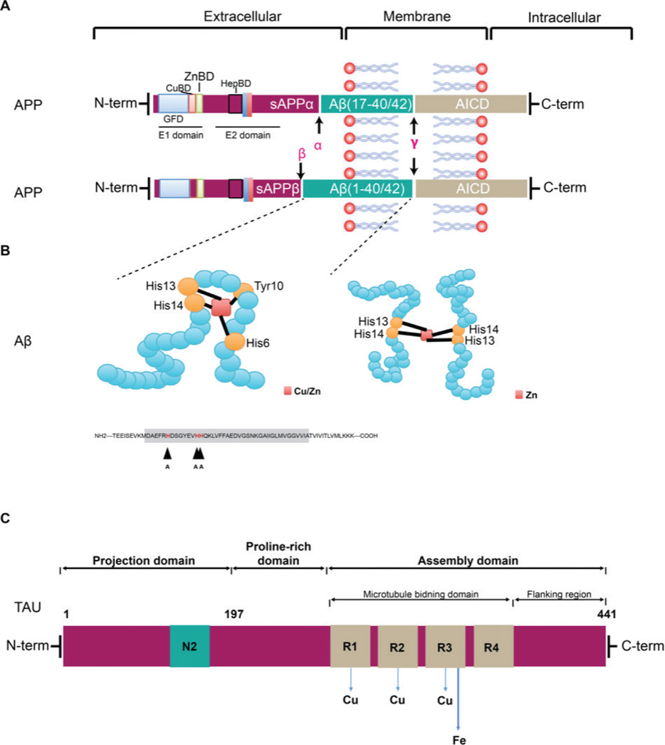 Figure 2 APP cleavage and APP and tau metal-binding sites. A) Cleavage of APP by α- and γ-secretases creates the sAPPα and Aβ17-40/42 fragments (upper panel). Cleavage by β- and γ-secretases creates the sAPPβ and Aβ1-40/42 fragments (lower panel). The N-terminal part of APP contains a CuBD, copper-binding domain; ZnBD, zinc-binding domain; HepBD, heparin-binding domain; GFD, growth factor-like domain. B) Two of several possibilities of metal interaction with Aβ. Below: Sequence of Aβ, 3 His in the Aβ peptide domain of human wild type (wt) Aβ are important for metal coordination. C) Representation of the three main domains studied in tau protein. The picture shows the binding sites of Cu and Fe, respectively, through R1, R2, and R3 regions in the MTB ensuring the binding to the microtubules.