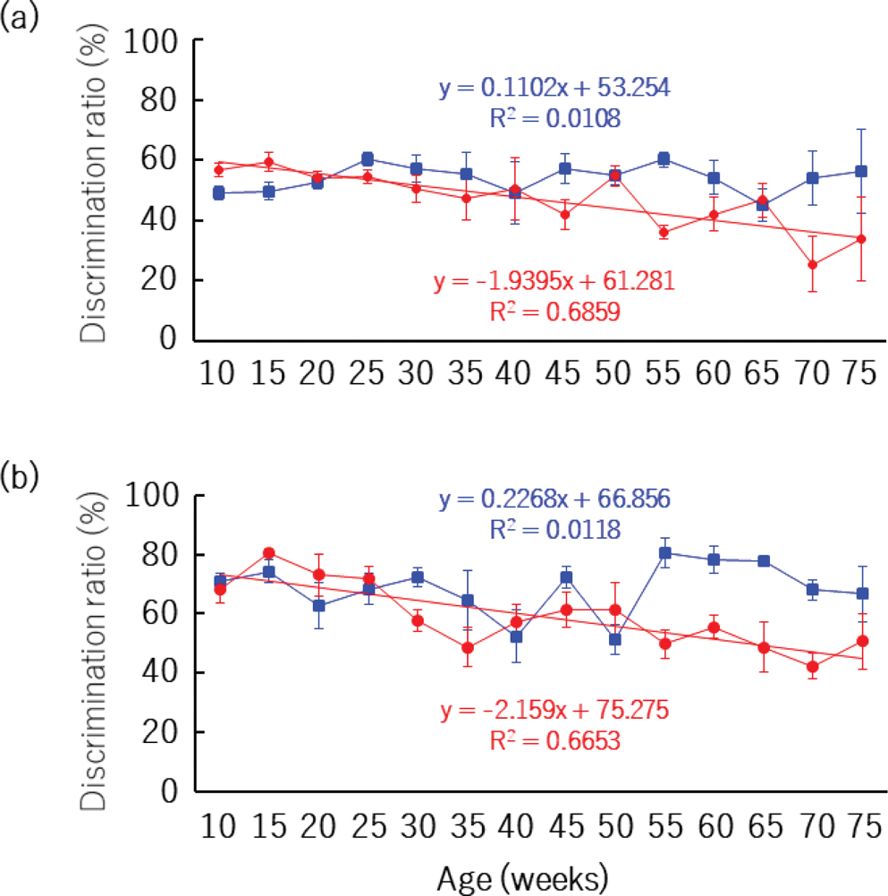Figure 3 Regression analysis of two behavior tests. (A) Ratio of exploring novel objects in the 5 min of OLT. Blue square and red circle indicate healthy control (HC) group and Alzheimer’s disease (AD) group, respectively. (B) Ratio of exploring for novel objects in the 5 min of object recognition test. In both panels means ± SEM are shown (57).