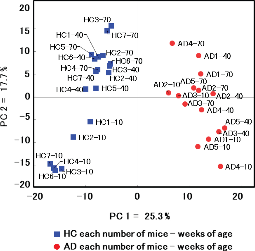 Figure 4 Comparison of metabolites in HC and AD mice feces. Principal component analysis of fecal metabolites in mice transplanted with microbiotas from a healthy volunteer (blue) and a patient with Alzheimer’s disease (red) (57).