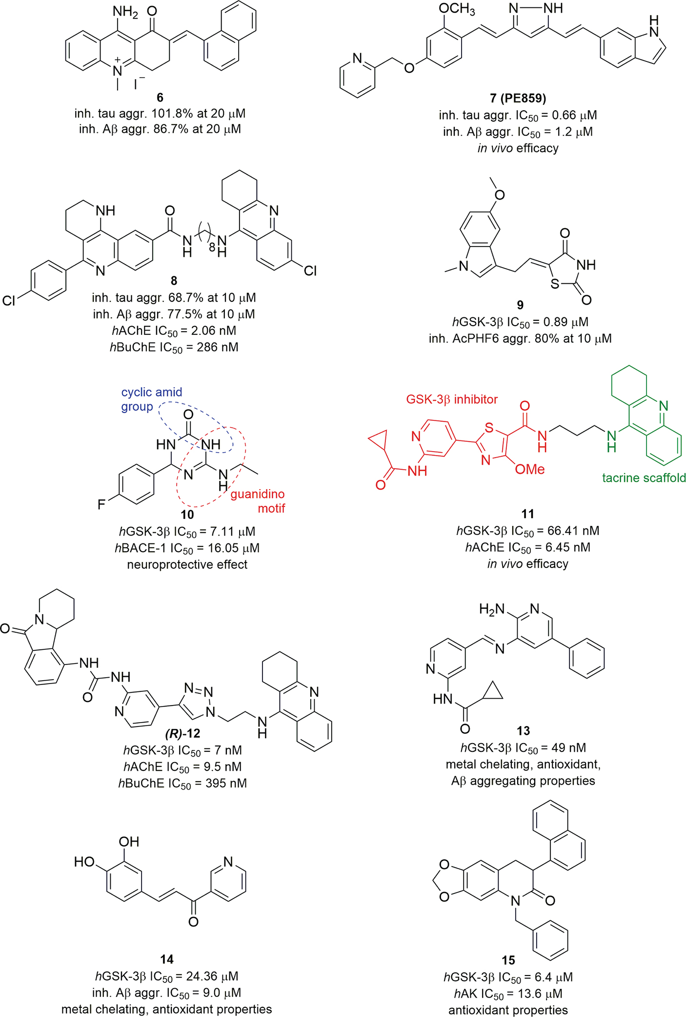 Dual Aβ and tau antiaggregating properties were also combined with anticholinesterase activity in order to achieve disease-modifying and symptomatic effects. However, it should be noted that such hybrid molecules were designed as dual binding site cholinesterase inhibitors with potential Aβ antiaggregating properties. The hybrids described by Muñoz-Torreo et al. (33) were formed by the fusion of 6-chlorotacrine, a strong AChE inhibitor, and the previously described tetrahydrobenzonaphthyridine derivatives capable of interacting with both active sites of AChE and displaying weak Aβ aggregation inhibitory activity. This combination allowed obtaining a group of compounds that can target tau, Aβ, and cholinesterases. The most potent derivative 8 (Figure 2) inhibited hAChE with an IC50 value of 2.06 nM and hBuChE with 0.286 μM, as well as Aβ42 and tau aggregation by 77.5% and 68.7%, respectively, in recombinant Escherichia coli cells at a concentration of 10 μM. However, a major disadvantage of this compound is its weak drug-likeness. Similarly, a series of shogaol–huprine hybrids displaying antioxidant properties, in addition to anticholinesterase and antiaggregating activities, was developed, which was characterized by poor drug-likeness (34).
