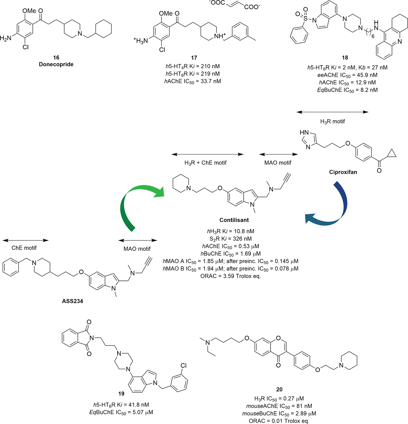 An international multiteam group discovered new multifunctional ligands with a broad and well-balanced spectrum of activities against H3R, AChE, BuChE, and MAO-A/B (55, 56). These new indole derivatives were designed by combining the neuroprotectant ASS234 with cholinesterase- and MAO-inhibiting motifs and ciproxifan containing H3R-blocking and MAO-inhibiting pharmacophore fragments (Figure 3). Among the newly formed hybrids, contilisant was identified as the most promising multifunctional agent. It inhibited hMAO-A (IC50 = 1.85 μM, after 30 min of preincubation IC50 = 0.145 μM), hMAO-B (IC50 = 1.94 μM, after 30 min of preincubation IC50 = 0.078 μM), hAChE (IC50 = 0.530 μM), and hBuChE (IC50 = 1.690 μM), as well as blocked H3R (Ki = 10.8 nM). Moreover, contilisant demonstrated in vitro antioxidant neuroprotective effects and the ability to penetrate the BBB in PAMPA. Due to its original in vitro biological profile, contilisant was selected for in vivo studies and tested using the novel object recognition test in mice with LPS-induced cognitive deficit. Based on the excellent in vitro data supported by positive in vivo activity, contilisant was studied further with the aim of exploring new pharmacological properties that may be potentially beneficial for AD therapy (57). The studies revealed another valuable activity of the compound: selective agonistic effect on Sigma 1 receptor (S1R) (Ki = 65.2 nM). S1R is associated with learning and memory processes, and hence, its agonists are used as antiamnestic agents in a variety of pharmacological models, probably due to the improvement of glutamatergic and cholinergic neurotransmissions. Additional in vivo studies including Y-maze and radical arm-maze tasks in mice with cognitive impairment induced by Aβ1–42 oligomers showed that contilisant exhibited higher activity in comparison with the commonly used anti-AD drug donepezil. Due to its multifunctional profile as well as in vitro activities, which were reflected in in vivo tests, contilisant thus seems to be an interesting multifunctional ligand for further development as a disease-modifying anti-AD agent (57).