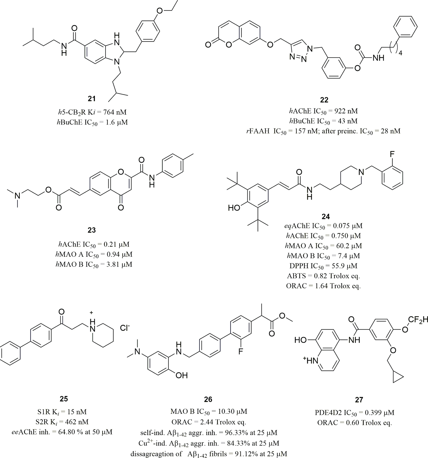 In turn, Hu et al. (69) developed a novel group of multifunctional compounds by combining clioquinol with rolipram or roflumilast. These compounds inhibited phosphodiesterase 4D (PDE4D), an enzyme participating in the process of memory consolidation and long-term potentiation. The most interesting of them was compound 27 (Figure 4), which inhibited not only the PDE4D with an IC50 value of 0.399 µM but also the metal-induced aggregation of Aβ, chelated metal ions, and exhibited antioxidant properties (ORAC [oxygen radical absorbance capacity] = 0.60 Trolox eq.). In addition to in vitro activity, compound 27 showed in vivo activity by demonstrating procognitive effects in the Morris water-maze test.