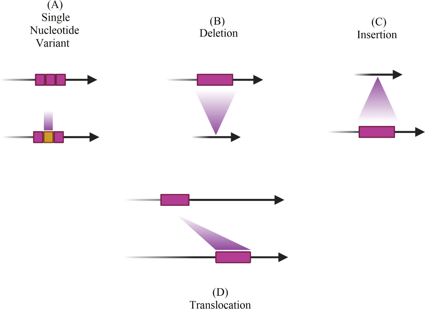 Figure 1. Different types of structural variations. A. Single nucleotide variant. B. Deletion. C. Insertion. D. Translocation.
