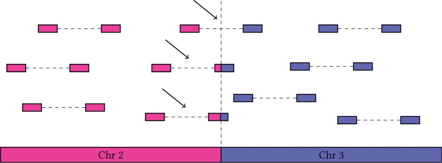 Figure 2. Discordant reads around a chromosomal translocation. The pink reads align to chromosome 2, and the blue align to chromosome 3. Paired reads where the mates align to different chromosomes (discordant reads; arrows) may indicate a chromosomal breakpoint.