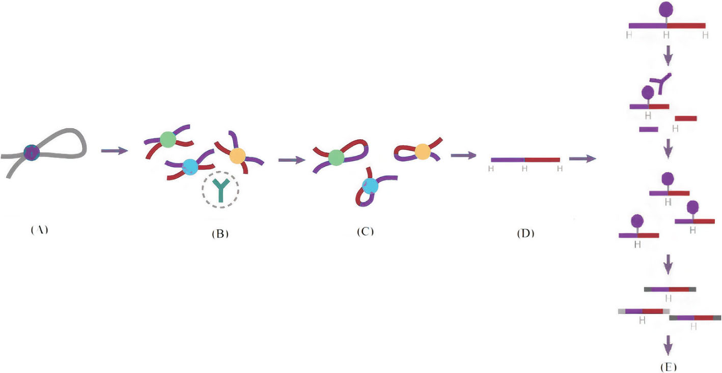 Figure 3. The Hi-C process. A. Crosslinking. B. Ligation. C. Digest crosslink chromatin. D. Reverse crosslink. E. Sequencing.