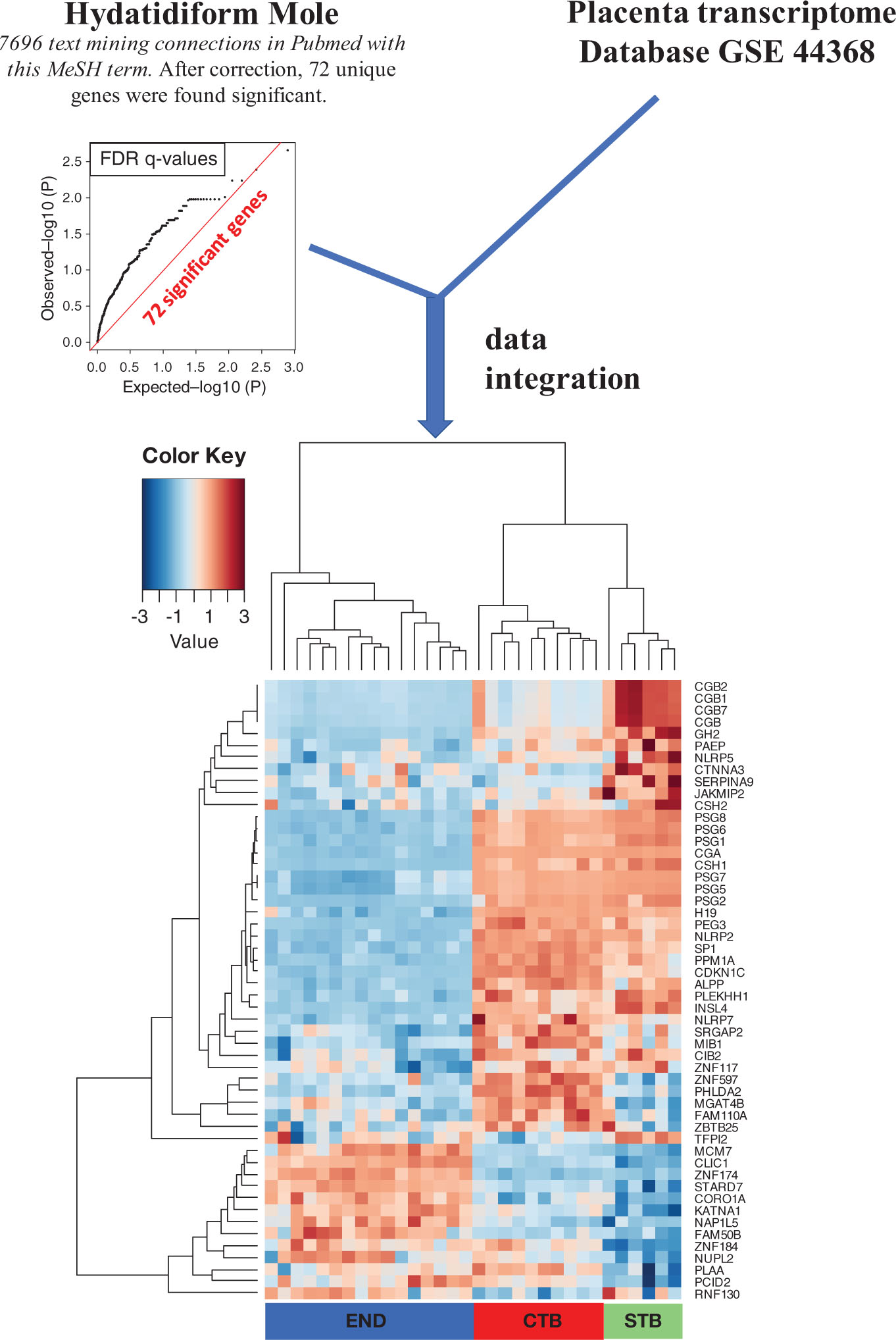 Figure 1. Integration of genes. Obtained from text mining research by MESH term “Hydatidiform Mole” with single cell transcriptome data of Human normal placenta from data set GSE 44368. A Heatmap was performed on the expression of hydatidiform mole related genes which discriminated placenta tissues (unsupervised classification was performed with Pearson correlation distances). End, endothelium; CTB, cytotrophoblast; STB, syncytiotrophoblast.