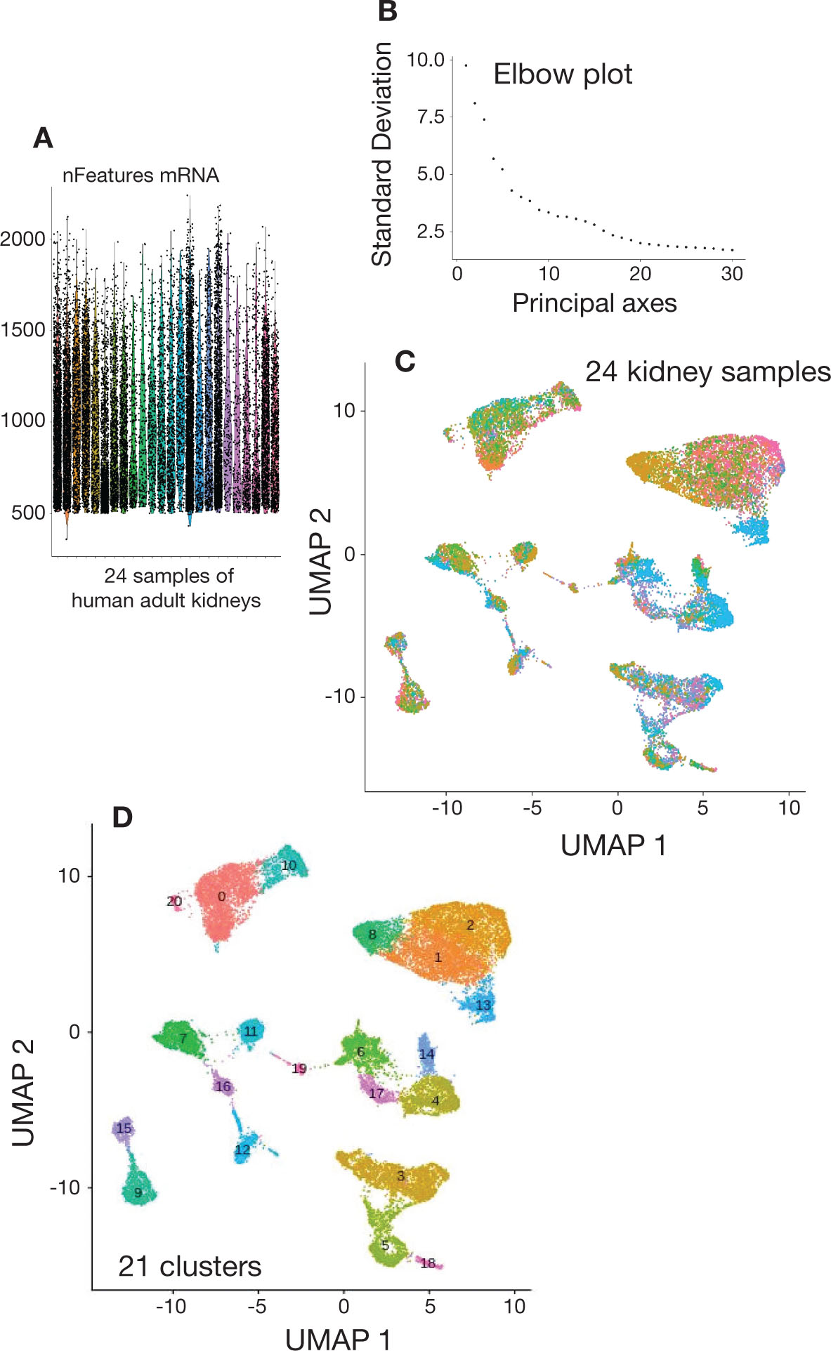 Figure 3. Single cell transcriptome analysis of human adult kidney. A. Violinplot of the numbers of features present in each cell and separated between the 24 merged kidney samples. B. Elbow plot presenting the standard deviation of the first 30 principal axes during dimensional reduction by principal component analysis performed on single cell transcriptome of human adult kidney. C. UMAP dimensional reduction performed on the single cell transcriptome of the human adult kidney: colors are attributed to the origin of the samples. D. UMAP dimensional reduction performed on the single cell transcriptome of the human adult kidney: colors are attributed to the 21 clusters identified during the analyses.