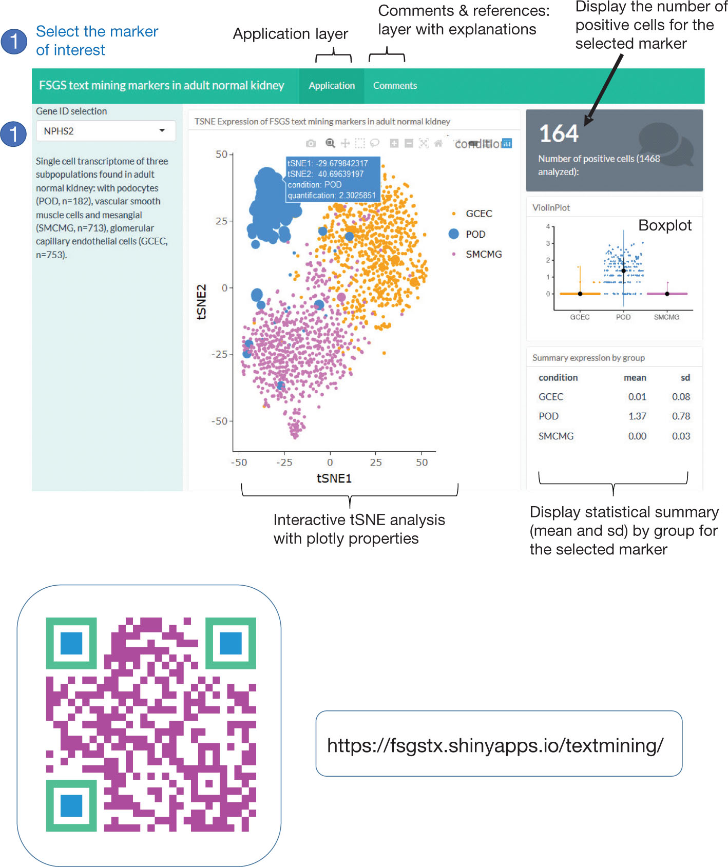Figure 5. Screenshot of the web interface for users with a description of the interactive visualization process. After gene ID selection (process 1), the single cell expression of text-mining FSGS markers is displayed using in interactive t-SNE analysis in the central panel with the number of positive cells, the violinplot of expression and a statistical summary by group of cells.