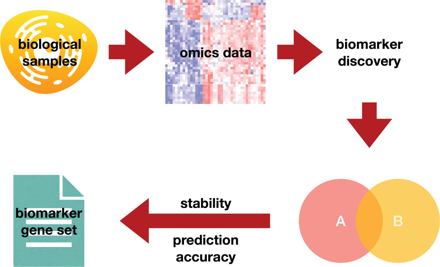 Figure 1. An illustration of using ensemble gene sets from multiple methods as the biomarker gene set. Omics data collected from biological samples are fed into multiple biomarker discovery methods which results in several gene sets (for example, A and B). Based on stability and prediction accuracy, the results from satisfactory methods are integrated into the final biomarker gene set.