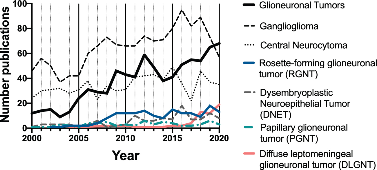 Figure 1. Number of publications from 2000 to 2020 by major glioneuronal tumor histologies. Author’s own analysis based on literature search information. Retrieved October to November 2020 from https://pubmed.ncbi.nlm.nih.gov/?term=glioneuronal+tumors&sort=date (35).