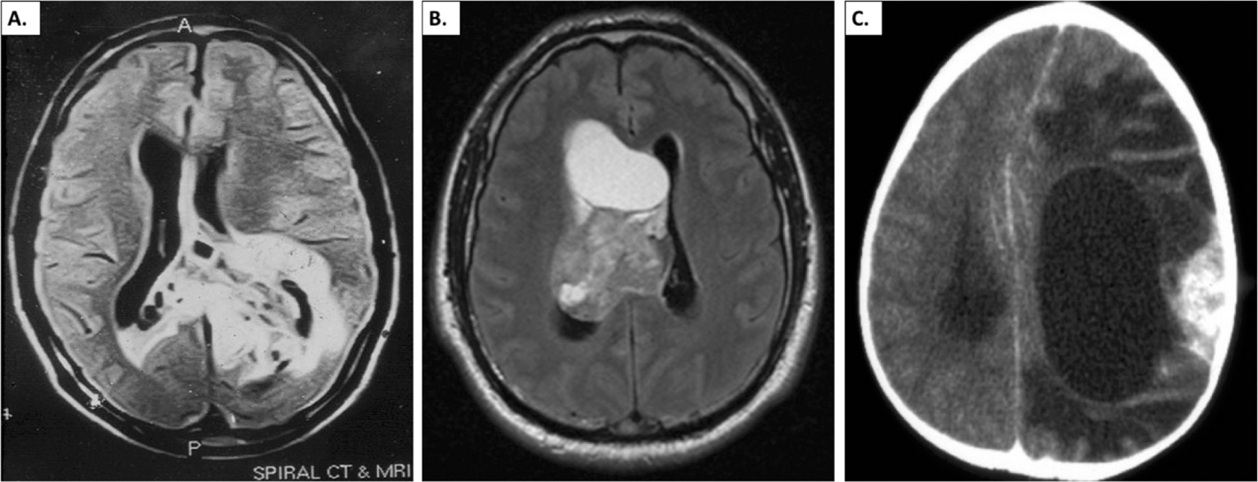 Figure 3. Radiographic appearance of glioneuronal tumors. A. Papillary glioneuronal tumor. Non-contrast magnetic resonance imaging showing hyper-intense lesion involving the left temporal and parieto-occipital regions. The tumor is crossing the midline to the right parietal region (adapted from 62). B. Axial FLAIR (fluid-attenuated inversion recovery) MR image showing a right ventricular mixed solid/cystic mass limited by the septum pellucidum and ventricular walls. With heterogeneous enhancement on post-gadolinium sequences. Provisional diagnosis of central neurocytoma, later confirmed on pathology (adapted from 63). C. Radiologic appearance of desmoplastic infantile ganglioglioma (adapted from 64).