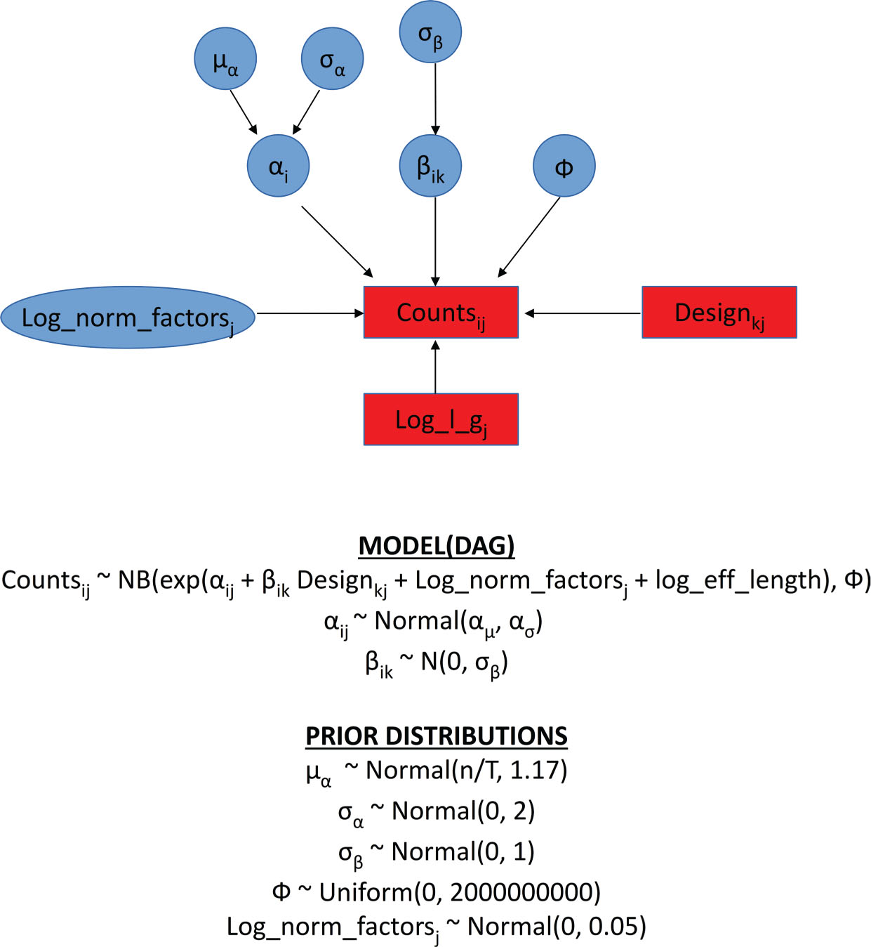 Figure 2. Directed Acyclic Graph (DAG) and probabilistic model for the identification of differentially expressed genes. The DAG represents all the parameters that describe the model and the dependence relationships among them. Parameters and hyperparameters are depicted in blue whereas the data are shown in red boxes. We are modeling expression counts with an NB model. The logarithm of the expected counts for each gene depends on an average gene expression value α, the expression change β among the different conditions defined in the design matrix, the normalization factors of each sample and on each gene effective length. The variability of the NB model described by the parameter Φ.