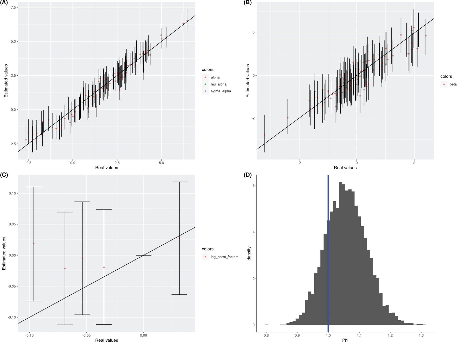 Figure 3. Results from the simulation and inference of differential gene expression using the Negative Binomial model with Stan. For the generation of these figures, a simulation of a dataset of 100 genes has been inferred with our model. For each parameter of interest, a posterior distribution of 2000 samples were obtained: A. µα, σα and α[1:100]. B. Log normalization factors[1:6]. C. β[1:100] coefficients. The simulated value is represented in the x axis whereas the inferred value in the y axis. The 90% posterior credible interval is represented as a vertical segment that covers the values of this interval along the y axis. The colored points represent the mean of the posterior distribution of each of the parameters. Correctly inferred parameters are those whose corresponding segments cross the diagonal line, indicating that the credible interval contains the simulated value. If the model is correctly calibrated, we expect that 90% of the credibility intervals for our parameters contain the real value simulated and therefore approximately 90% of the vertical segments should touch the diagonal. In D, a histogram of the posterior distribution for Φ phi is shown, with the simulated value that is trying to be estimated depicted as a vertical line in blue.