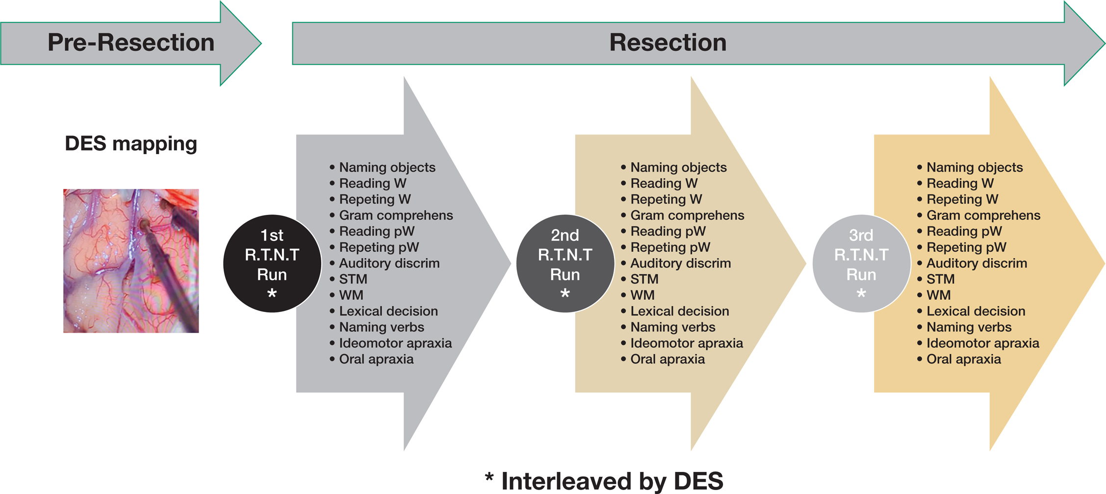 Figure 1. Sequence of events during awake surgery. The neuropsychologist uses a large number of tasks for the same area switching them quickly to reduce the risk of mismatching between test and surgical area. After craniotomy, cortical mapping is performed by direct electrical stimulation (DES) while RTNT starts at the beginning of resection and ends at the beginning of haemostasis. At intervals during the resection, DES is performed.