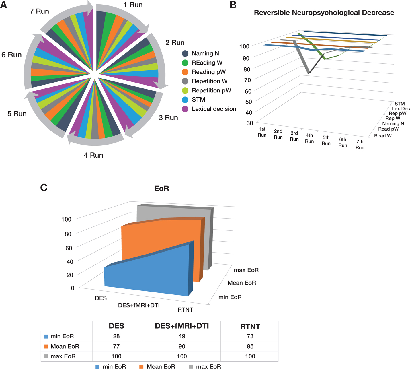 Figure 3. Sequence of RTNT runs and list of tasks. A. The same color represents the same task which is repeated across Runs (yet with different stimuli). B. Patient’s performance, expressed in accuracy (%), shows that for naming and lexical decision tasks there was a reversible neuropsychological decrease around the 3rd Run. We learnt recognizing and detecting reversible neuropsychological deficit patterns, which are often followed by recovery, allowing to proceed with the resection. A positive DES would simply have stopped resection. C. The extent of resection over time evolved and increased when RTNT was introduced.