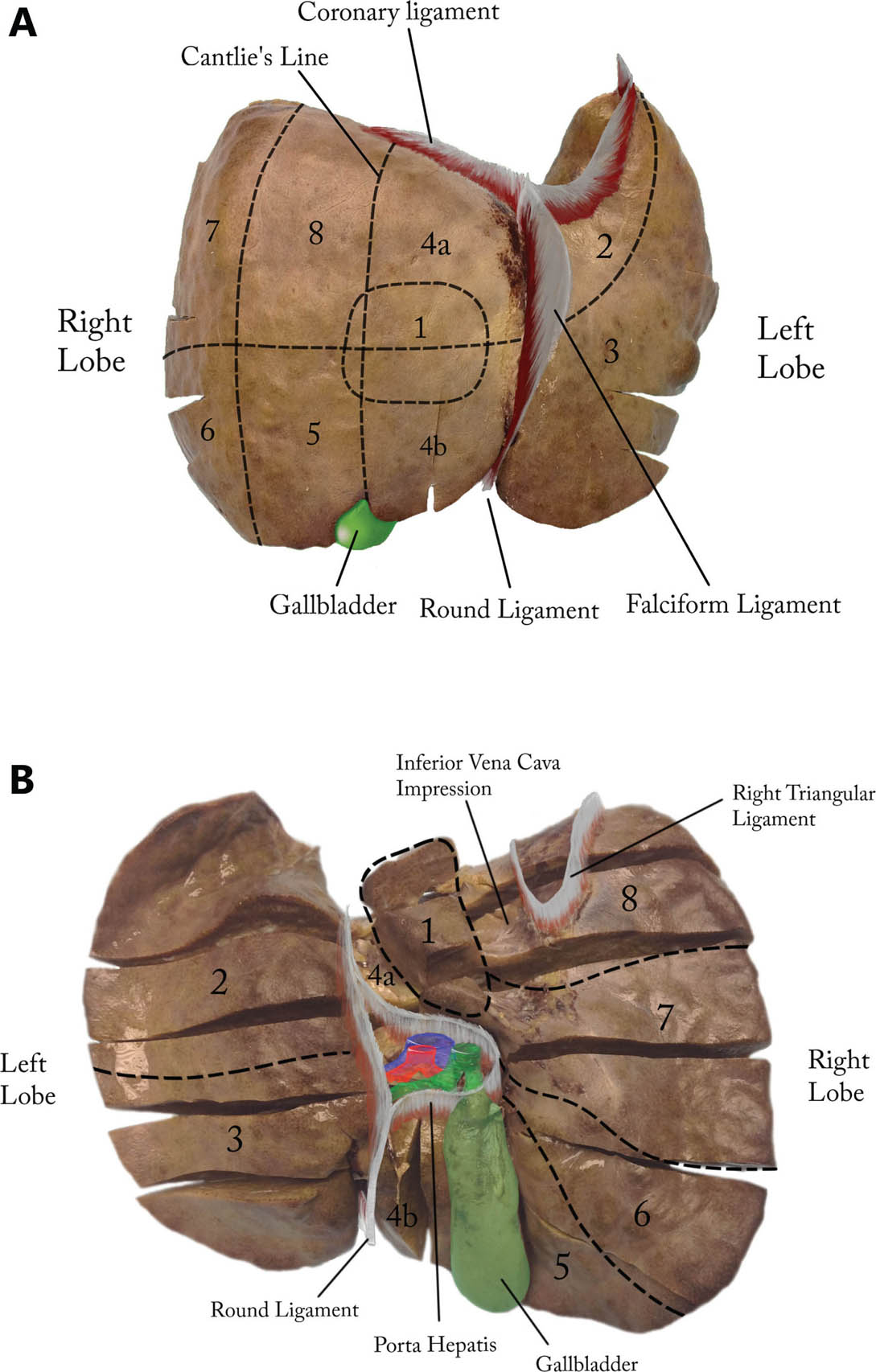 Gross descriptors of liver anatomy, in practice, are generally an ad hoc miscellany of older anatomical landmarks (7), along with the more functional Couinaud liver segments (8). Generating and reviewing gross descriptions of liver resections require an understanding of both.