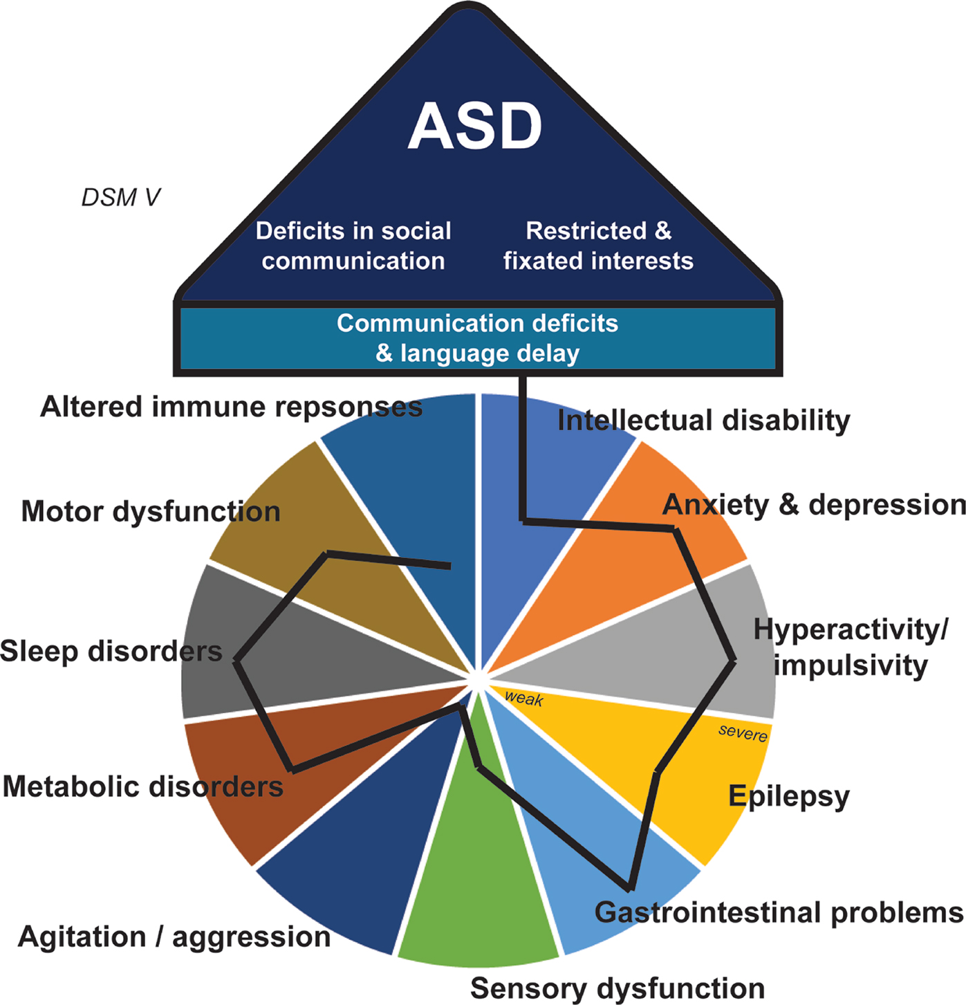 The clinical features historically associated with ASD are the triad of impairments in speech, social interaction, and the presence of repetitive or restricted behaviors. However, ASD are also associated with many co-morbidities, which can be psychological and physiological.