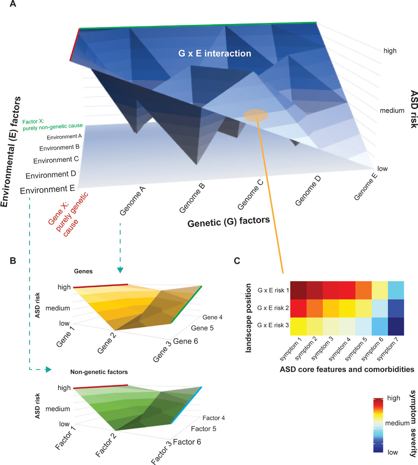 Figure 2. Model for the etiology of ASD. A. ASD are caused by genetic or environmental factors or a combination of these. For some individuals, ASD is solely caused by the presence of the genetic mutation(s) (red line). Exposure to a certain environment may cause ASD independent of the genetic background in some individuals (green line). In most cases, the genetic setup of an individual will, in combination with the exposure to environmental factors, determine the risk for ASD. For example, while a person with genome A may be at low risk in environment A, the same person may have high risk in environment E. B. Each genome and each environment is a combination of many genetic factors (upper panel) and non-genetic factors (lower panel), respectively. Whether a genome confers a high risk of developing ASD may be determined by a single mutation, i.e., as seen in many syndromic forms of ASD (red line), or a combination of gene variants, where ASD-associated variants may act in a simple additive way (green line) or are in a more complex relationship. For example, the ASD-associated gene 3 may result in low risk if in combination with gene 6, but the risk increases in the presence of gene 5. Thus, multiple variants will increase ASD risk, but specific gene variants may also decrease the overall risk. Similarly, the presence of one particular environmental factor may be such a strong trigger that it acts independently of other environmental factors (red line). In many cases, however, a combination of environmental factors will determine the overall risk contributed through non-genetic factors in an additive or more complex relationship. C. In case the risk of developing ASD surpasses a threshold, the genetic factors, environmental factors, and their interplay will determine the severity of ASD symptoms and the presence and severity of comorbidities. This results in considerable heterogeneity among ASD.