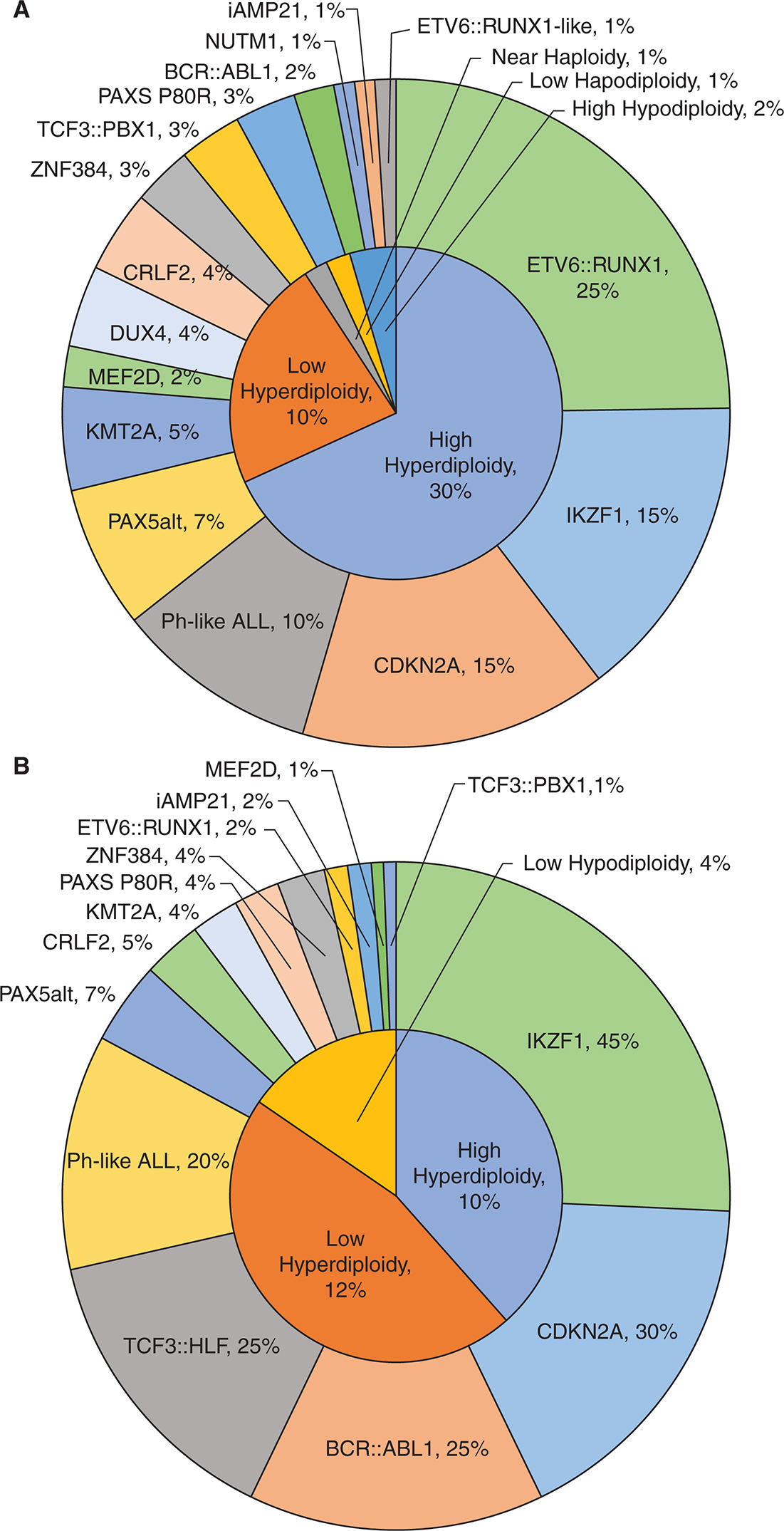 Figure 1. Pie chart of frequencies of the major subgroups of B-ALL. A, Pediatric B-ALL. B, Adult B-ALL.